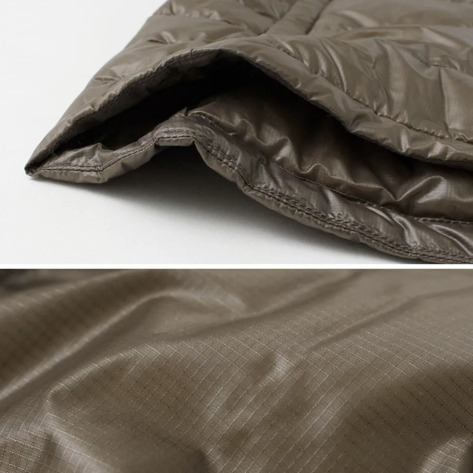 The outer fabric is a densely woven 10 denier ripstop nylon fabric. Although thin, it is highly durable in terms of water repellency and tearing, and the softness of the down gives it an appealing feel.