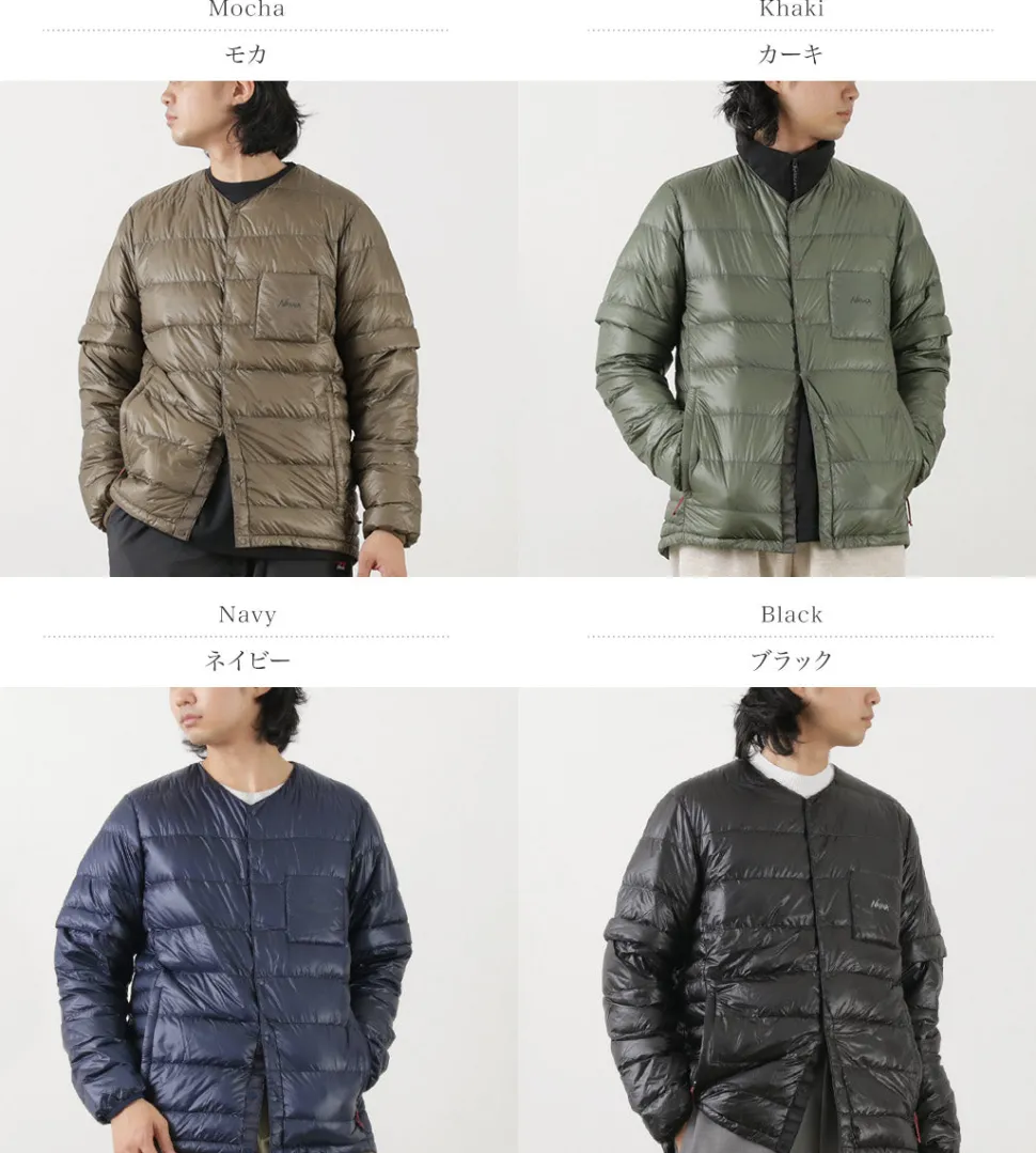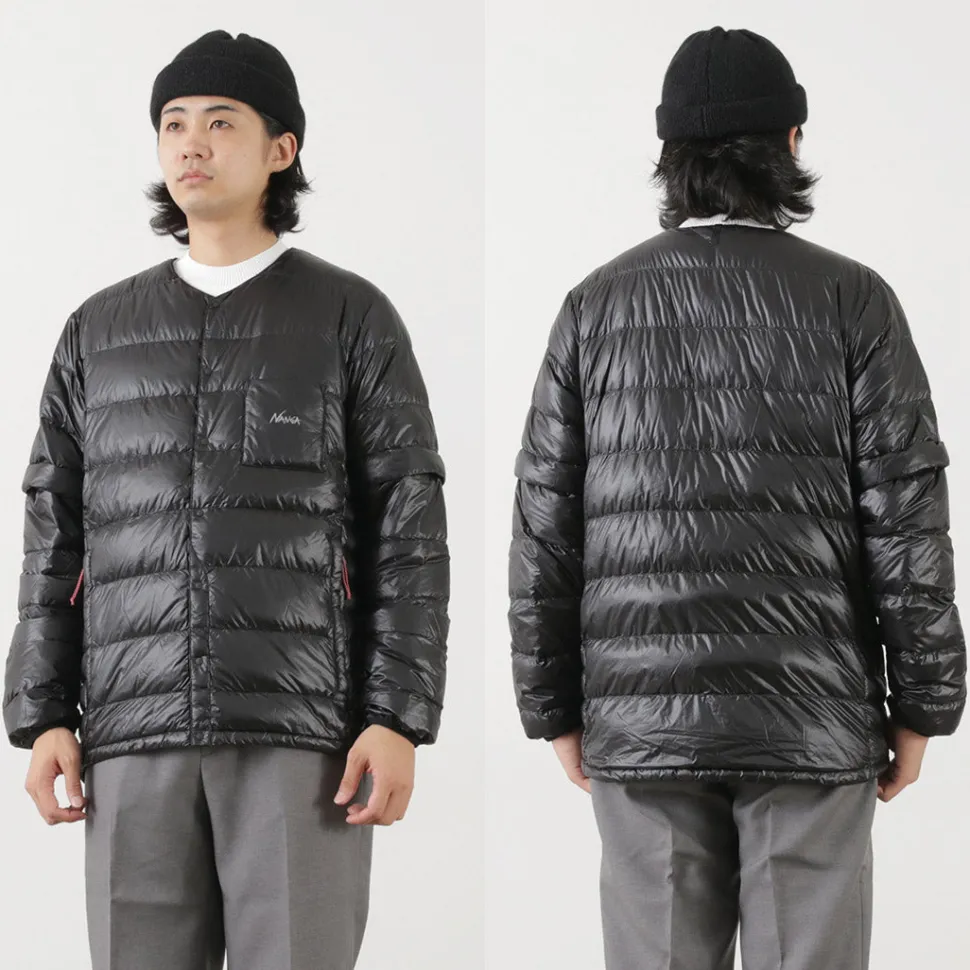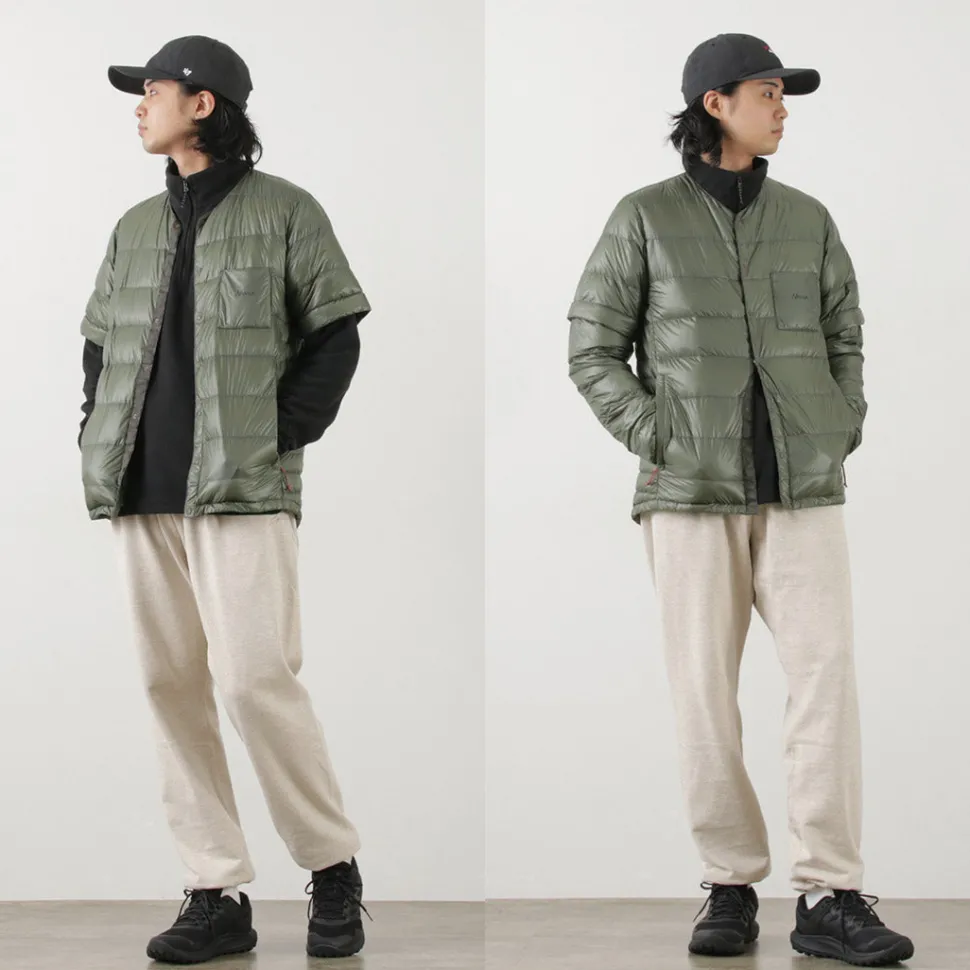 At first glance, this simple down cardigan has detachable sleeves and can be converted into a down tee. It can be worn as inner down as well as outerwear on its own.