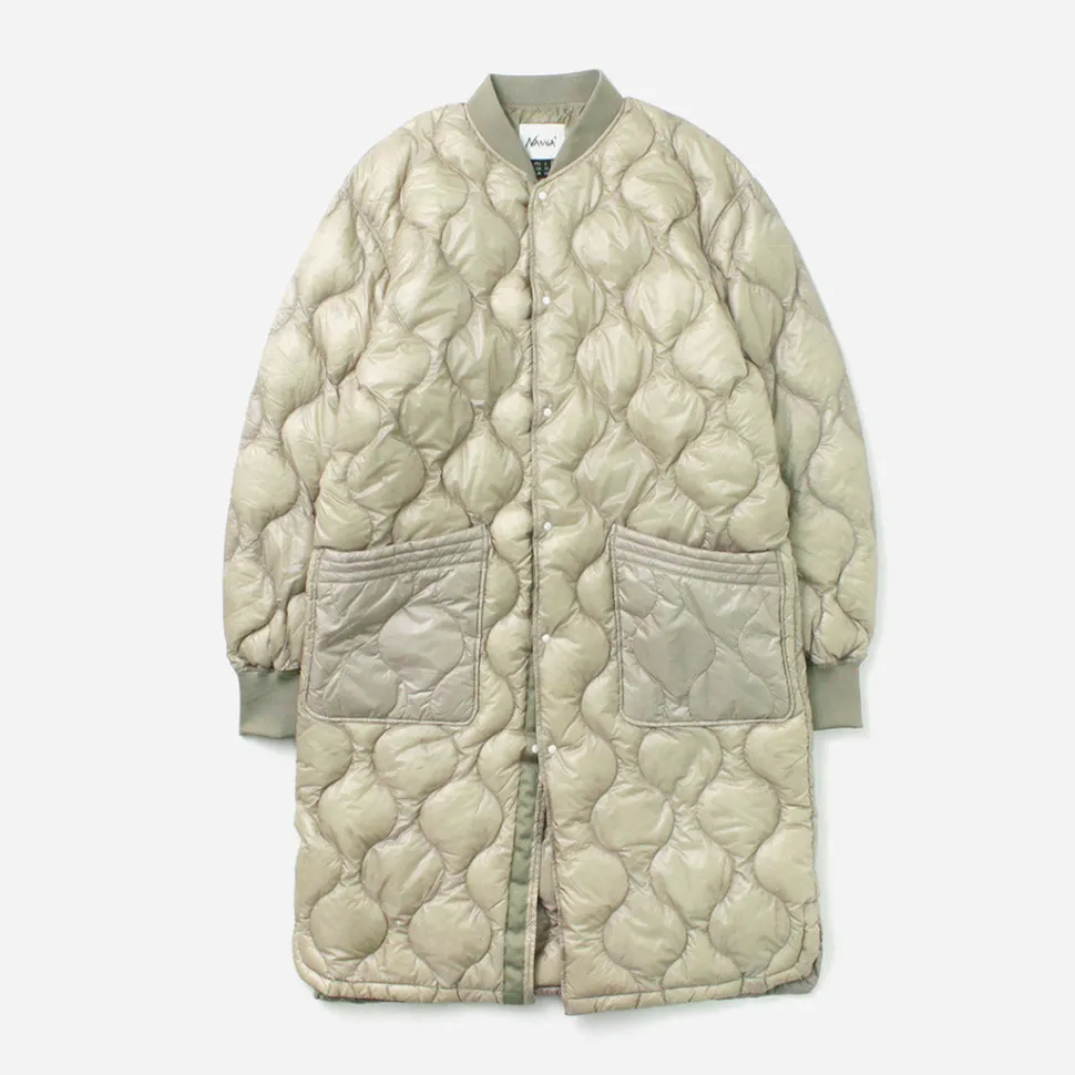 Long down coat with a quilted design based on a military coat liner. Can be worn on its own or as an inner layer for an overcoat, allowing you to enjoy a variety of styling options.