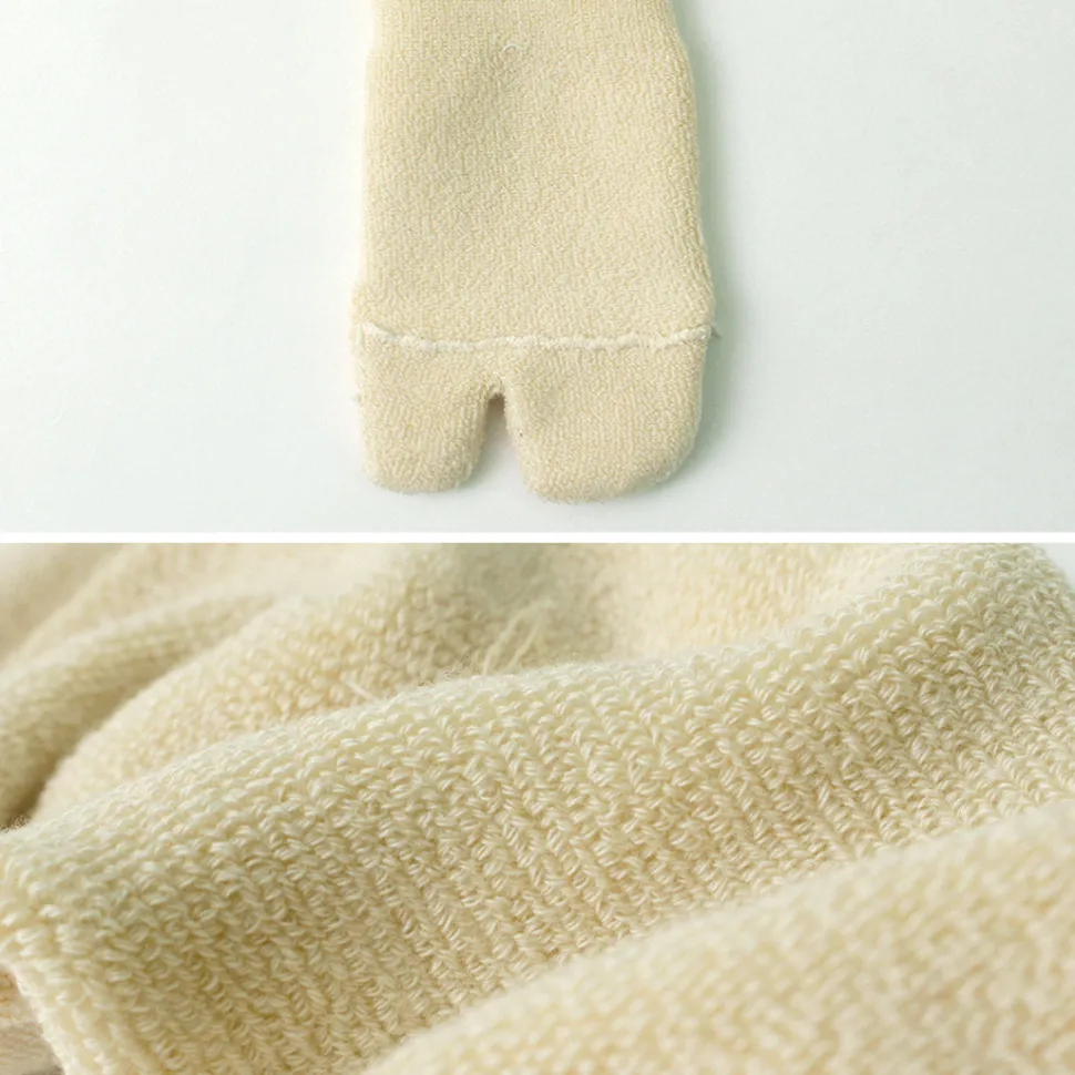 The tabi-style design, with the toes separated into two sections, not only serves as a design accent but also offers many health benefits. These include reducing foot fatigue and pain, improving posture and gait, preventing bunions, and alleviating cold feet.