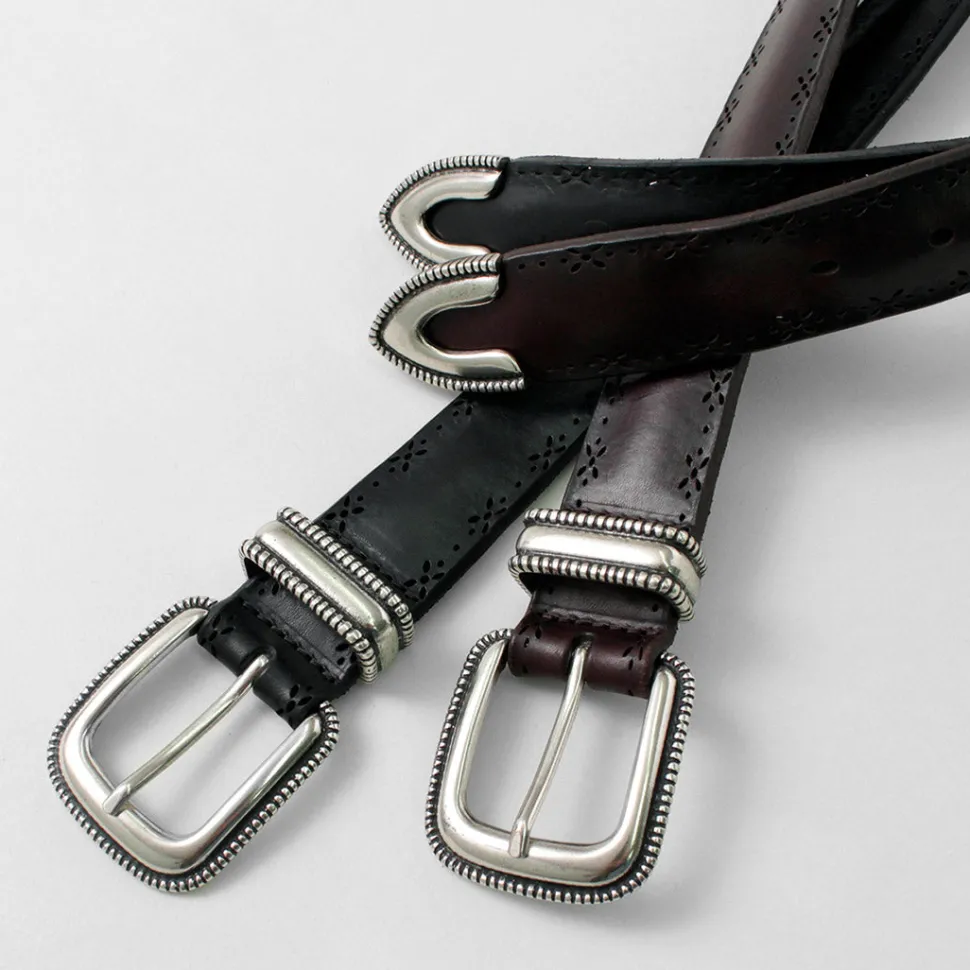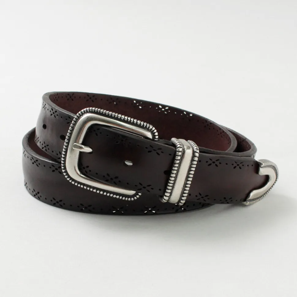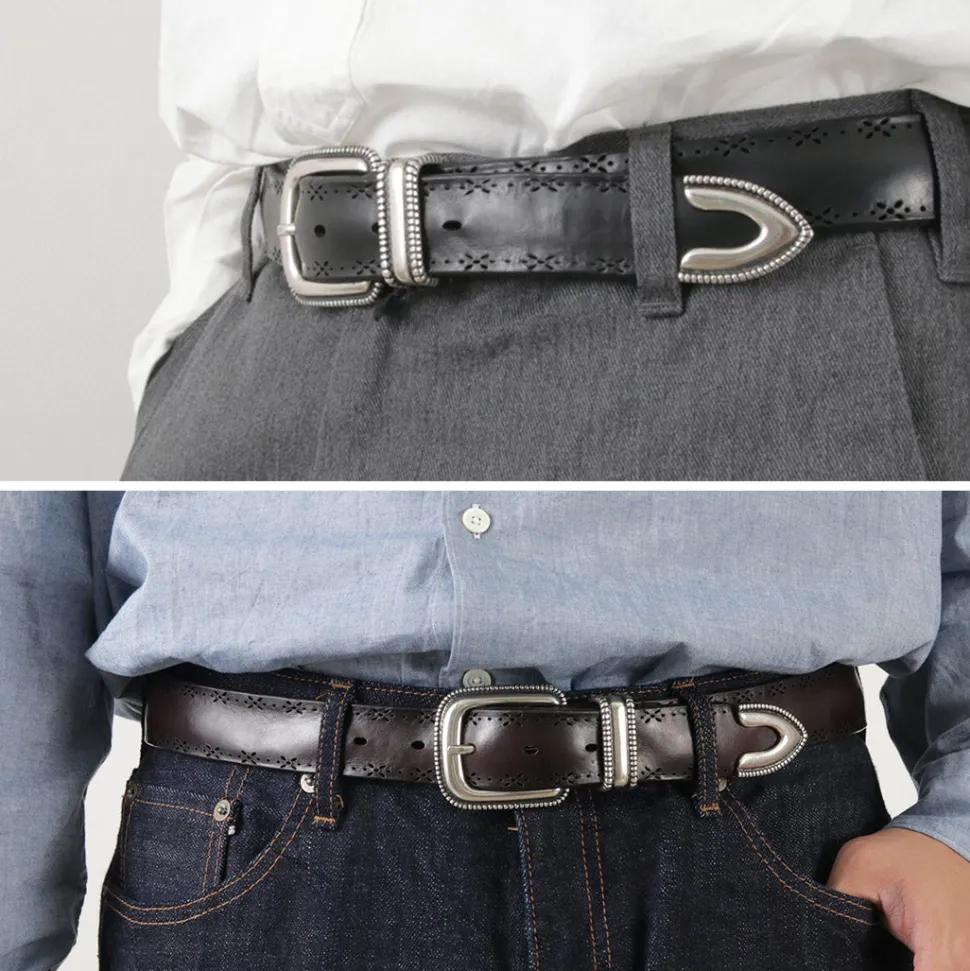 ORCIANI introduces a leather belt that stands out for its delicate details. This item is characterized by its thick and heavy bull hide leather and decorative metal parts. While the look gives off a unique presence, it goes well with a variety of bottoms and can be expected to play an active role in a wide range of coordinates.