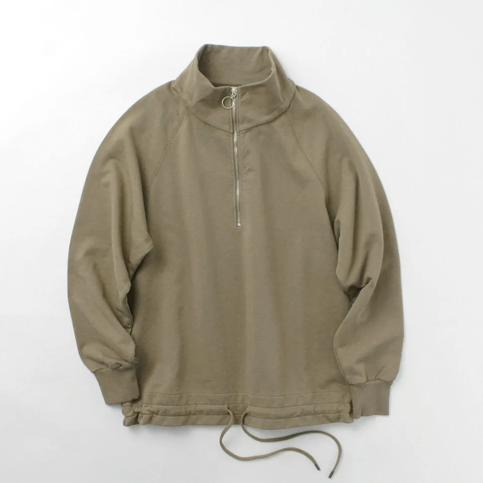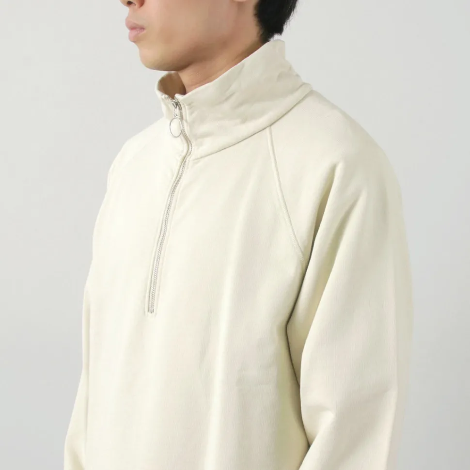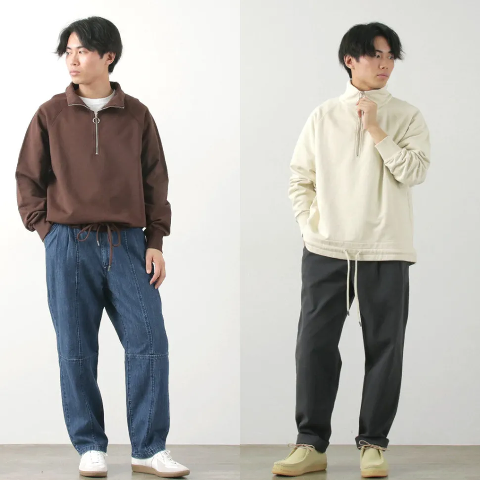 It features a half zip at the neckline. Slightly open in a standing collar state for a sporty look, or fully closed for a turtleneck-like appearance. Moreover, by fully opening and folding down the standing collar, it can also be made to look like a wing collar. Whether open or closed, it adds to the overall look, and it pairs well with shirts or T-shirts for layering.