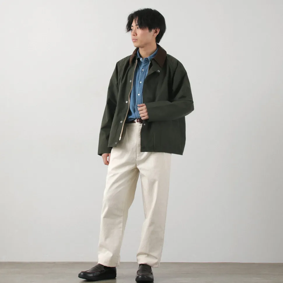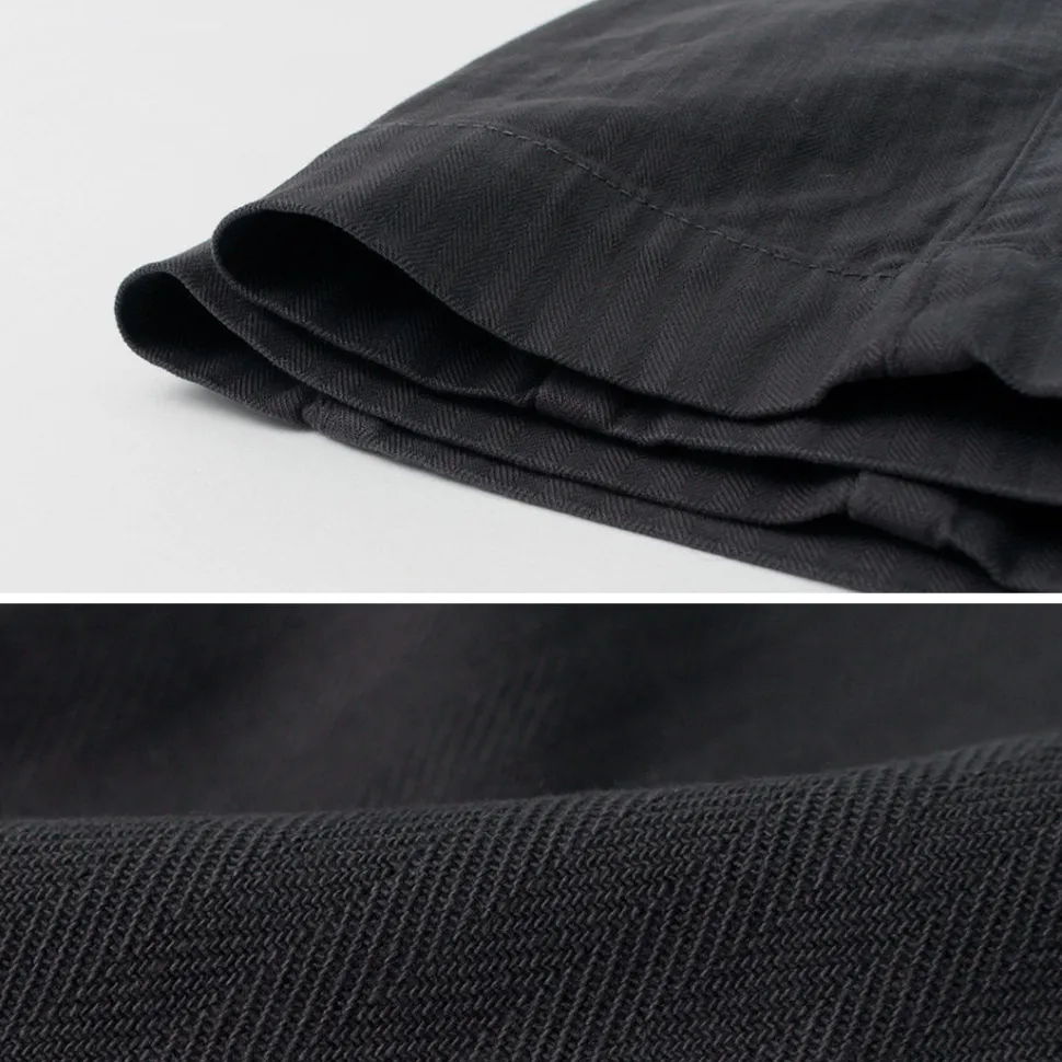 It uses twill fabric with moderate thickness. It is finished with a natural texture unique to 100% cotton, featuring a soft texture that feels good on the skin from the beginning. Moreover, it has a faint gloss characteristic of herringbone on the surface, which matches well with clean-cut coordinates, despite being a casual material.