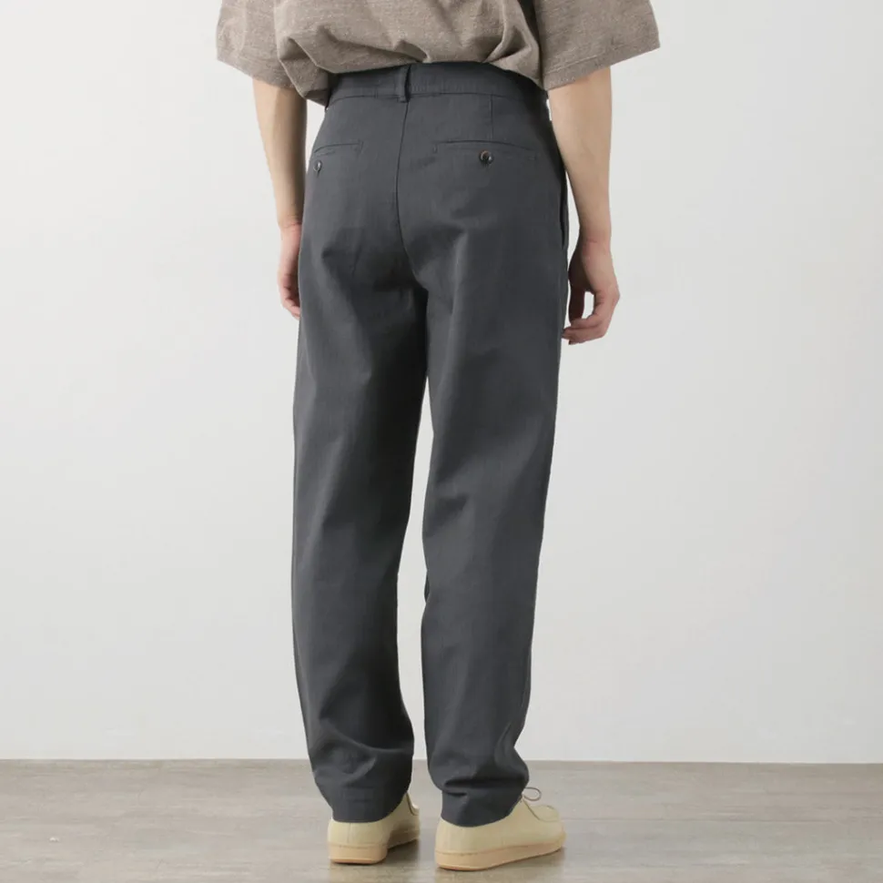 The front features a durable YKK zipper fly. It uses high-quality corozo buttons used in men’s suits, adding a subtle accent to the coordination. It has two pleats at the waist, providing a comfortable fit around the waist while allowing roominess and enhancing ease of movement.