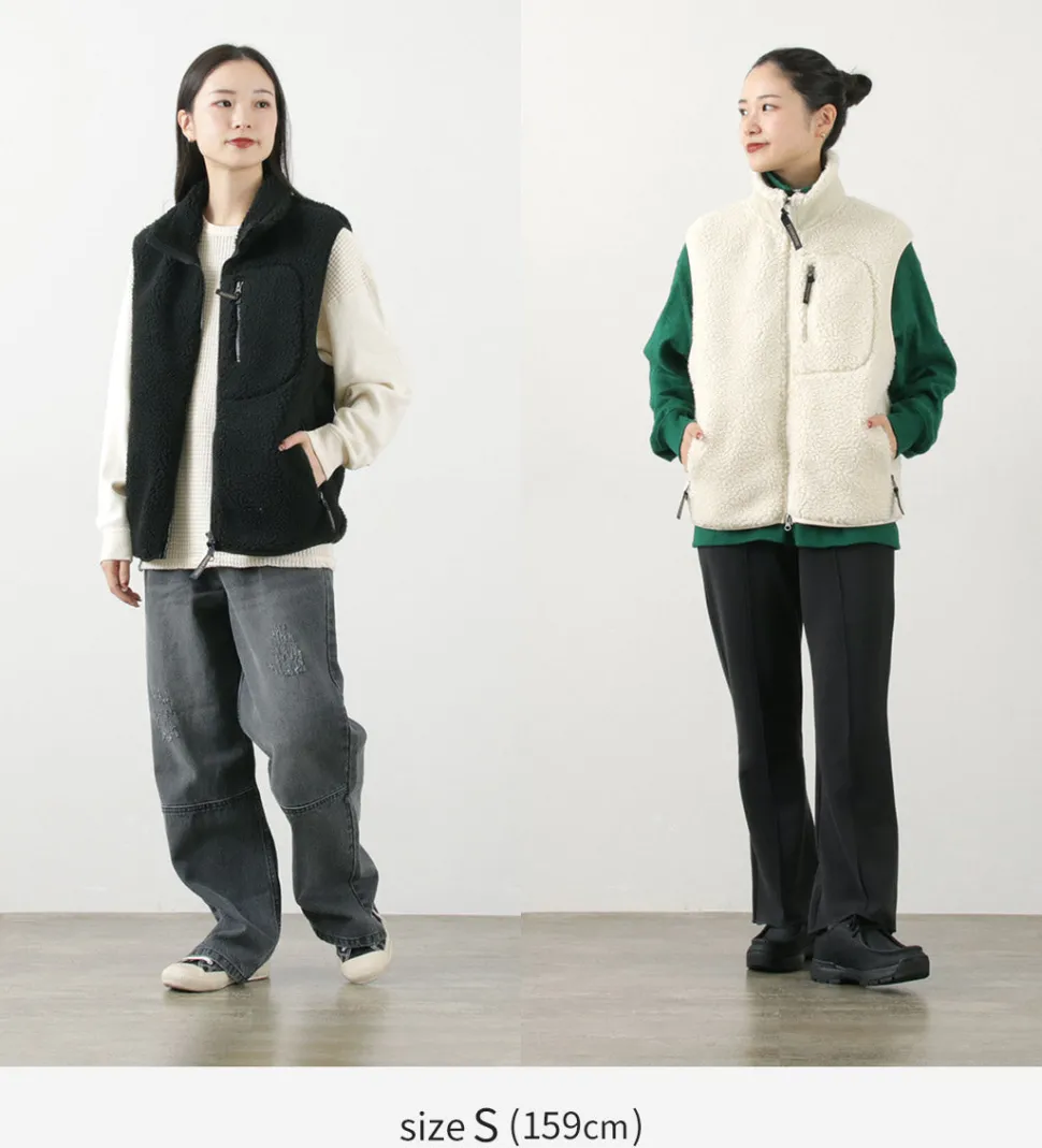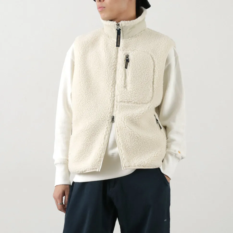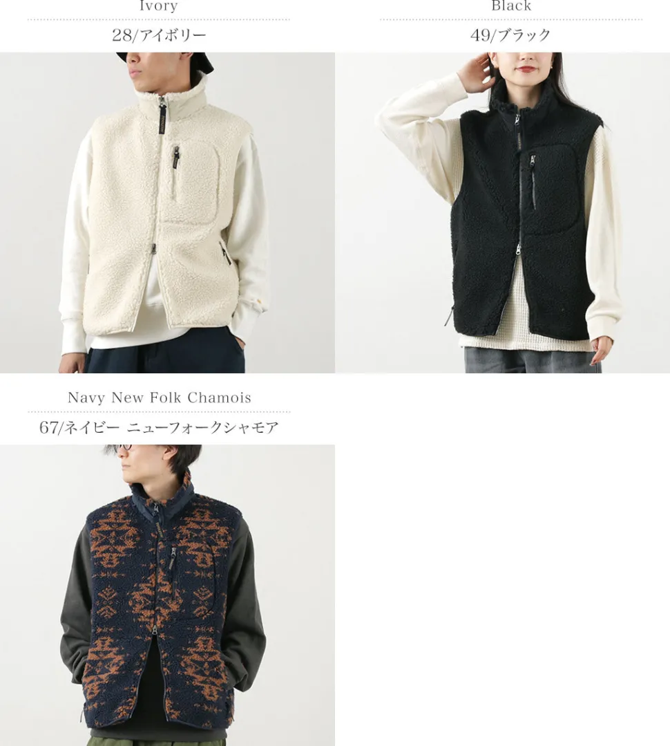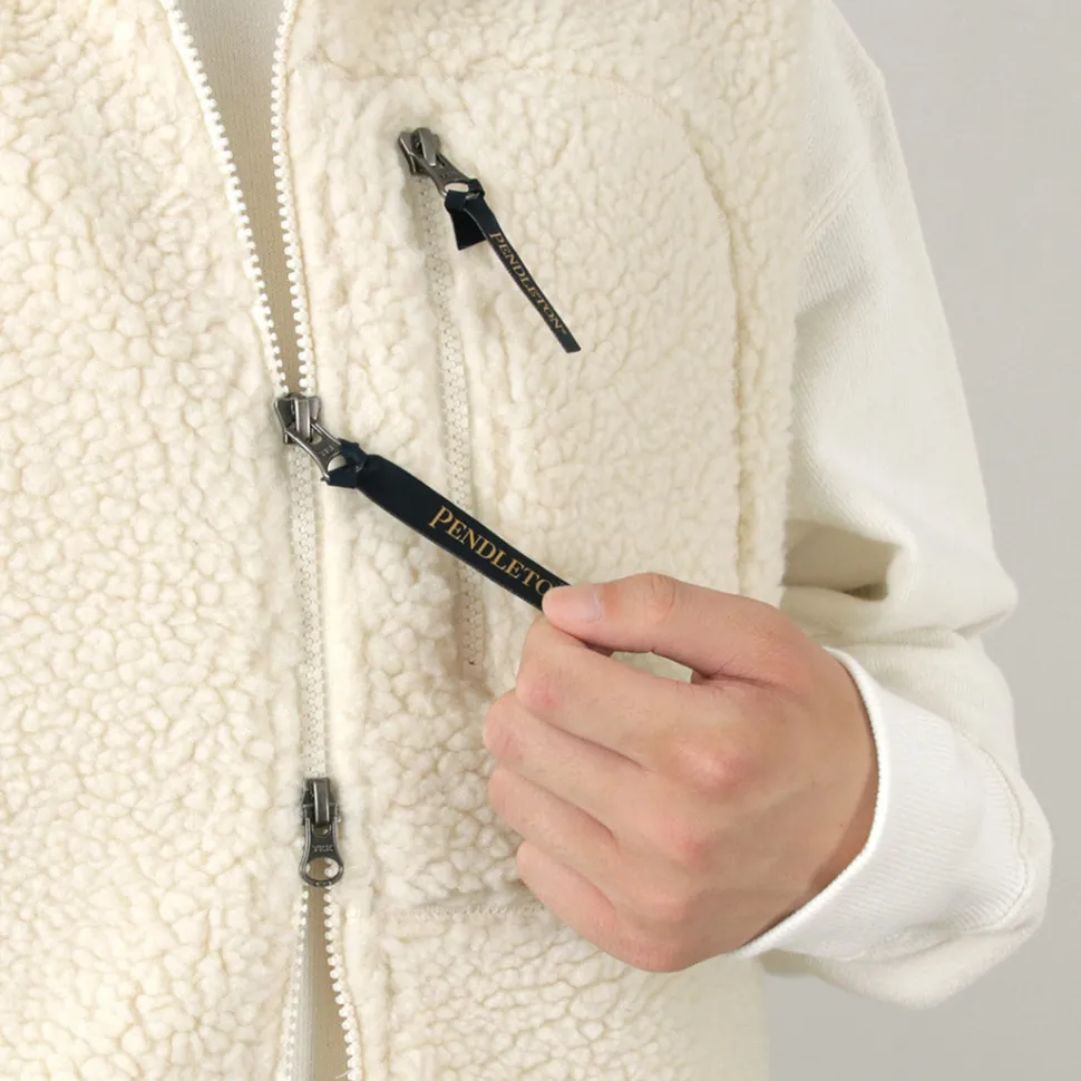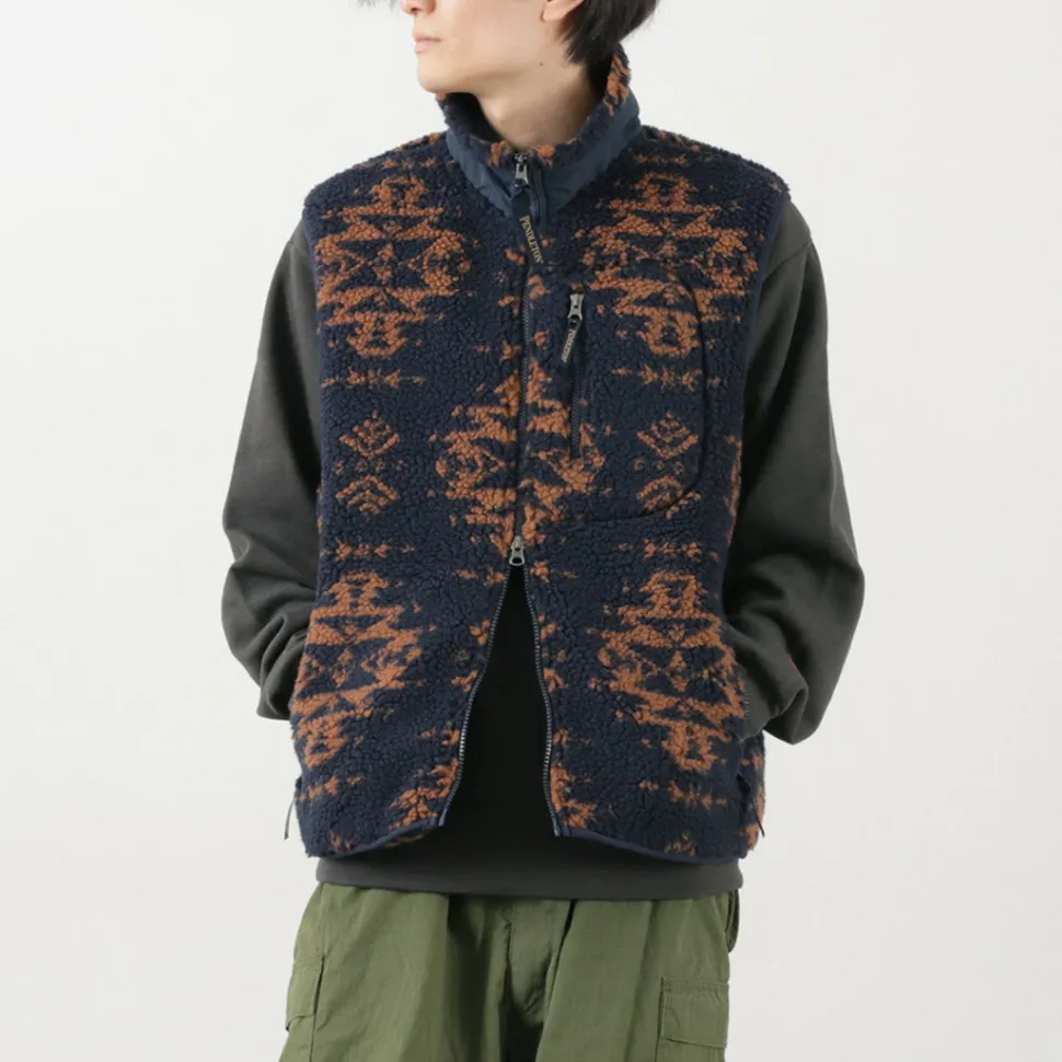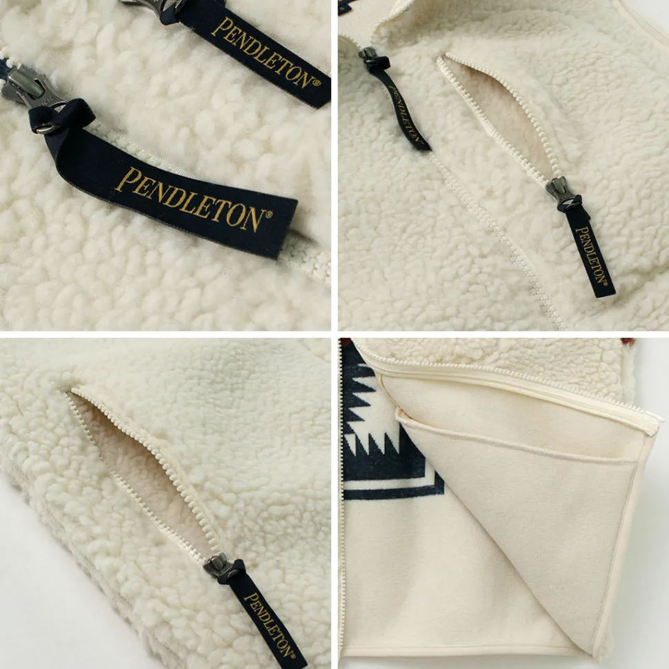 Zip boa vest with PENDLETON’s unique native pattern. With a warm stand collar and double zipper, this vest can be worn in a variety of ways.