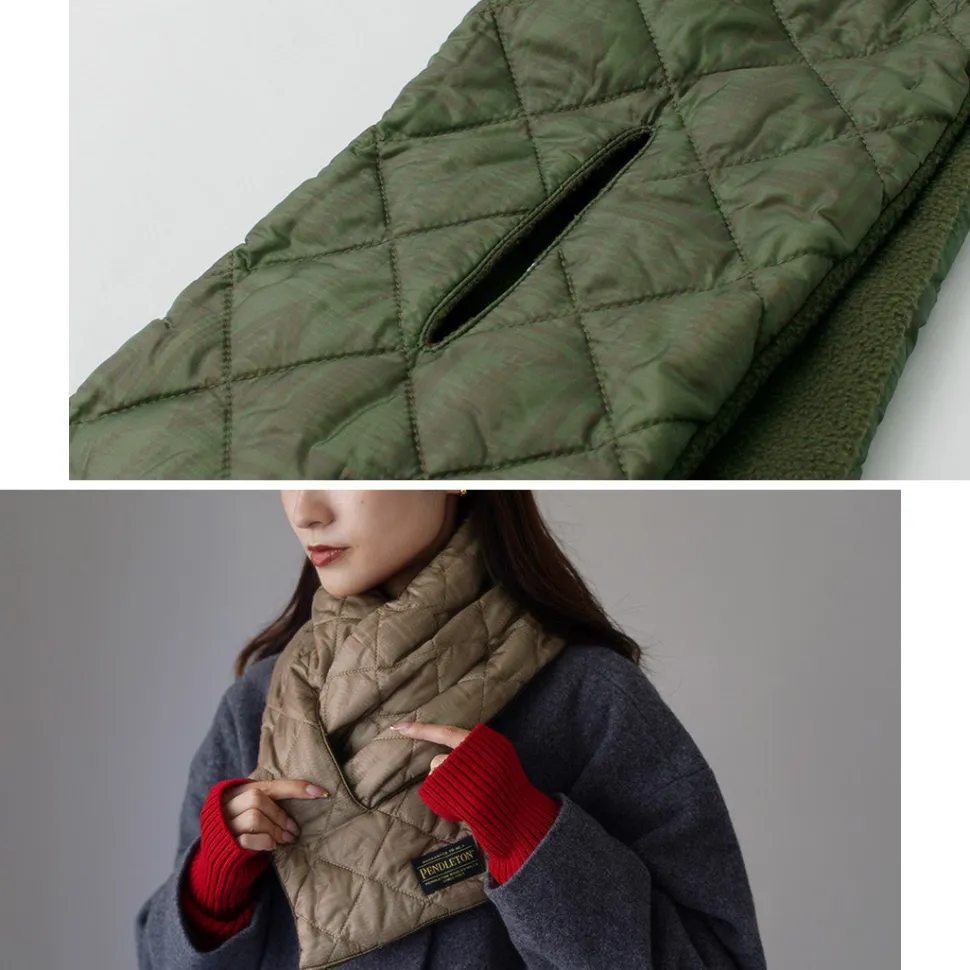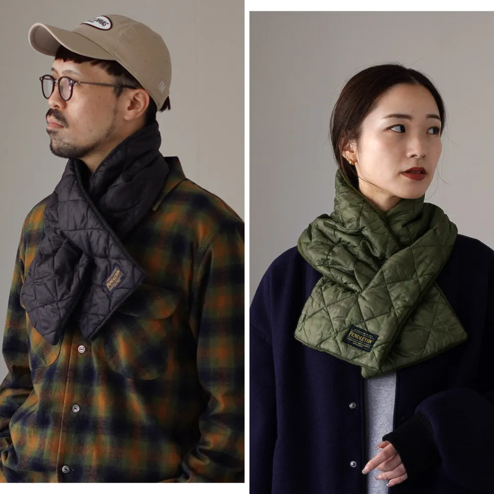 This quilted scarf from PENDLETON features a subtle native pattern in a range of similar colors. It is made with the high-function padding material “3M Thinsulate”, and is a great winter item that is thin and lightweight yet has excellent heat insulation properties.