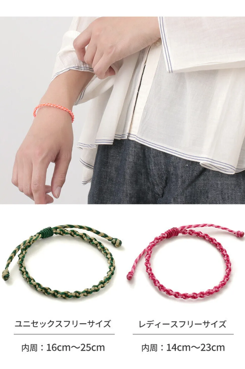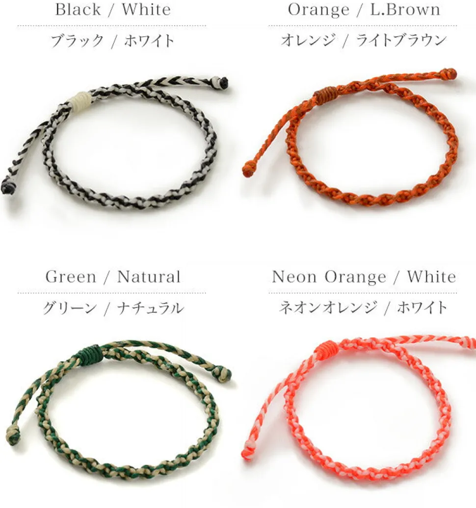 This two-tone bracelet is made of braided wax cord and has a natural texture. It is made of natural grass that has been soaked in oil and then braided, giving it a natural, tasteful texture. The knots are easy to tie and the material is sturdy, so it will take on a new look with use. It is also water resistant and does not fade or change color due to sweat or rain, so it is used as a material for surfers’ accessories. The perfect balance of not too thin and not too thick makes it easy to layer with other accessories. Available in two sizes for unisex use.