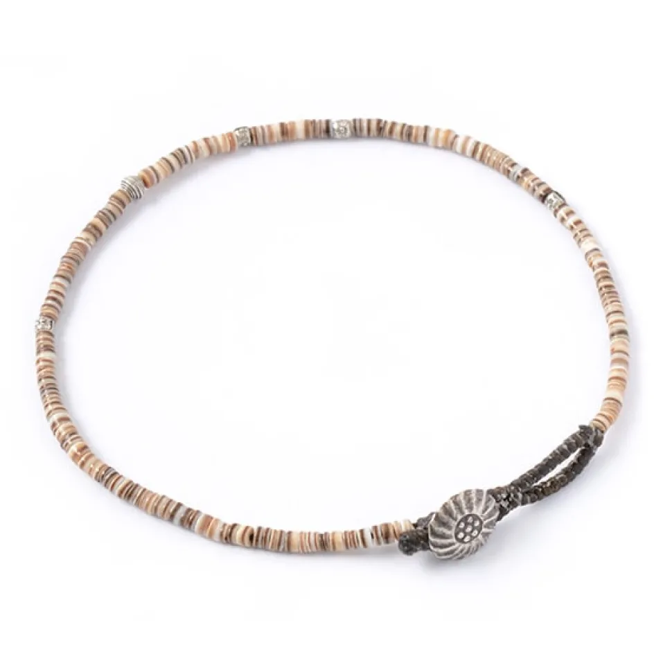 The clasp and body are made from Karen silver, which is handcrafted one by one. The shell beads are used to great effect to bring out the charm of the Karen silver beads.
