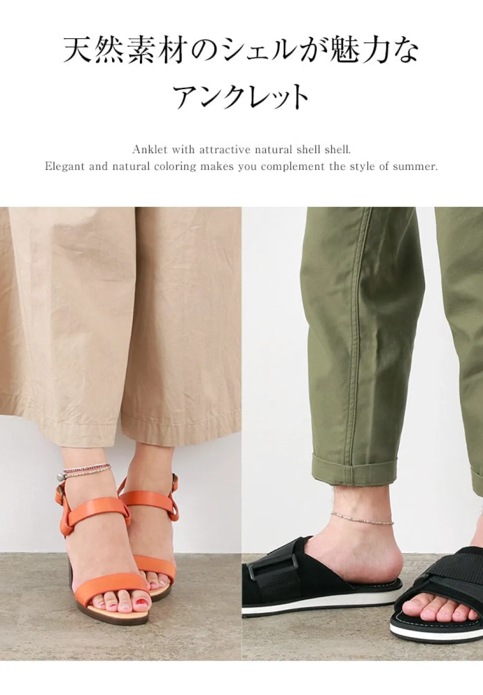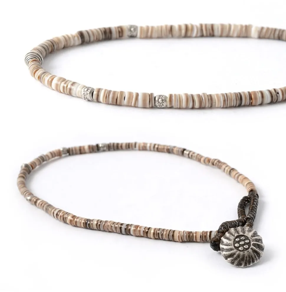 Anklet made of natural shellsAnklet made of Philippine shell beads. This accessory is made of a series of disk-shaped beads carved from natural shells, and has a simple yet ethnic look with exquisite colors. Nowadays, the number of craftsmen who can process such disks is decreasing, making these beads rare. The handmade, tasteful bead design and elegant, natural coloring will enhance your summer style. Waxed cord is strong and water-resistant. Waxed polyester fibers are soaked in wax and spun to make the normally sturdy cord even stronger. Each piece of Karen silver is handcrafted by a small group of mountain tribesmen in Myanmar and northern Thailand, and its warmth is its greatest appeal.