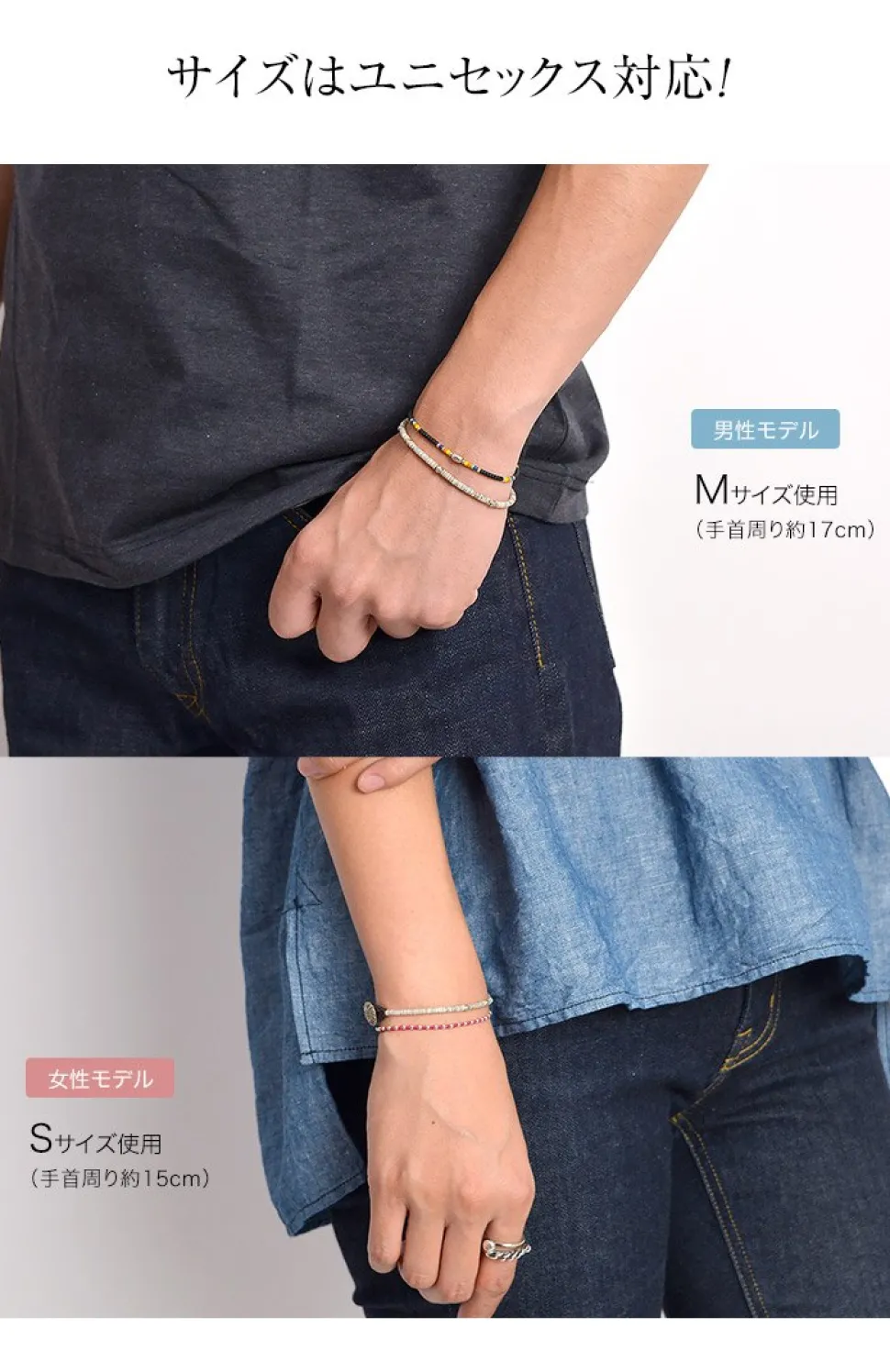 This bracelet is made of shell beads from the Philippines. The bracelet is made of disks of beads carved out of natural shells, and has a simple yet ethnic look with exquisite colors. Nowadays, the number of craftsmen who can process such disks is decreasing, making these beads rare. The handmade, tasteful bead design and elegant, natural coloring will enhance your summer style. Waxed cord is strong and water-resistant. Waxed polyester fibers are soaked in wax and spun to make the normally sturdy cord even stronger. Each piece of Karen silver is handcrafted by a small group of mountain tribesmen in Myanmar and northern Thailand, and its warmth is its greatest appeal.