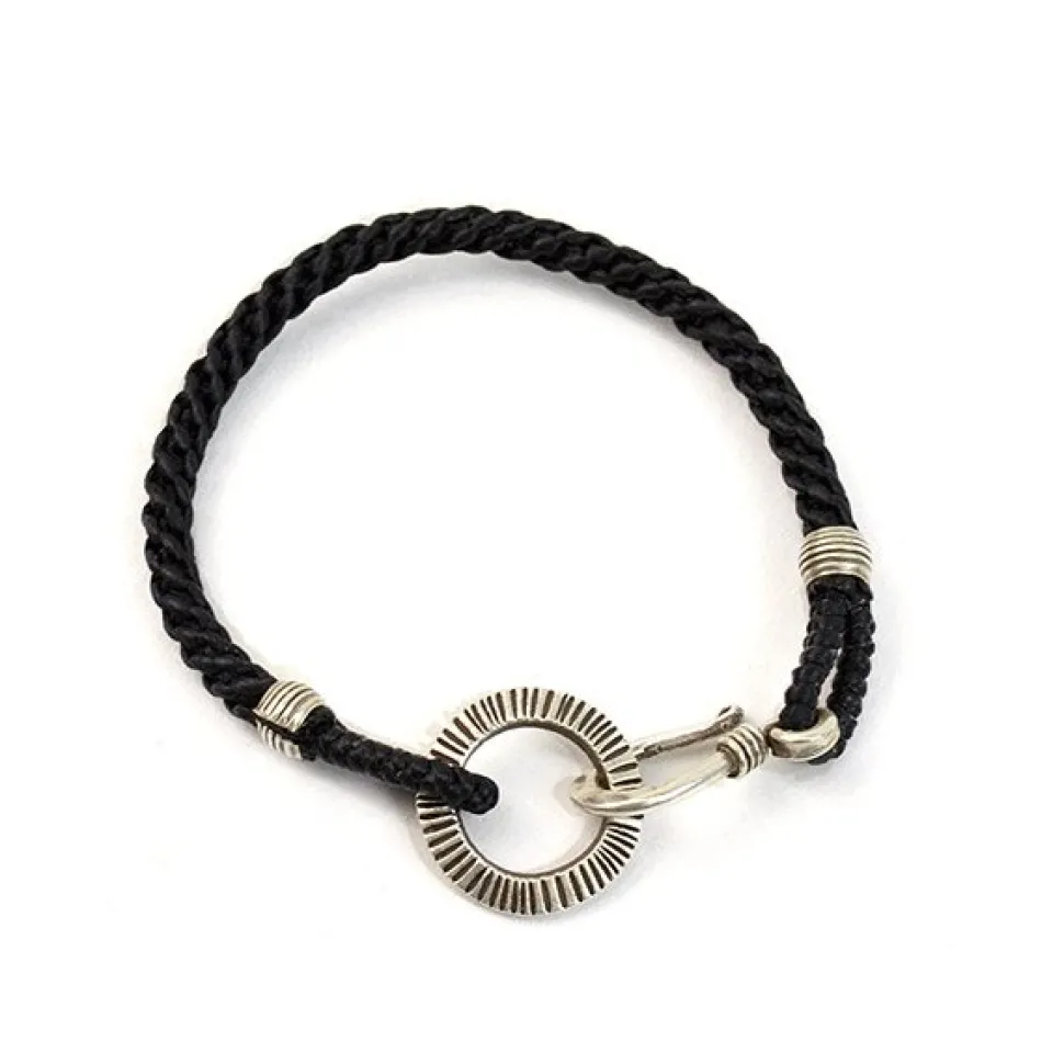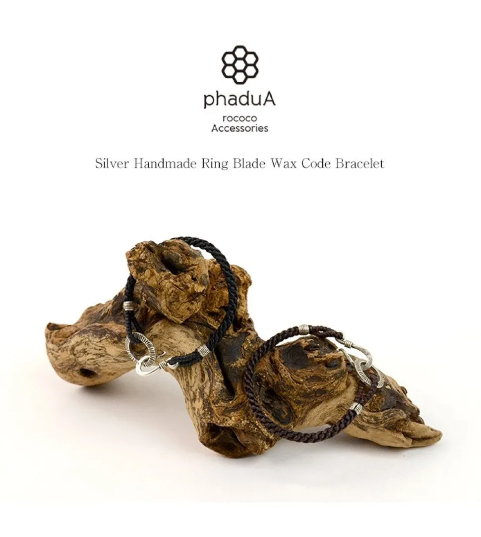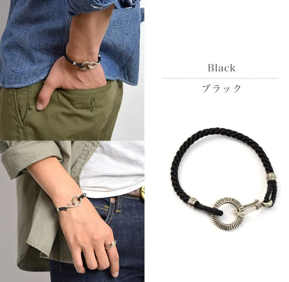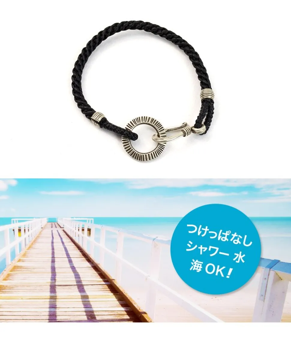 Braid Wax Cord Bracelet with Native AtmosphereA braided wax cord bracelet with a handmade ring pendant and hook as the main components. The original ring pendant is custom-made in Karen silver, and is attached and detached with a hook. I tried to keep it simple while keeping the native feel, and to enhance the presence of the ring and hook. It is made of a material that can be used in both shower and ocean water, so you can leave it on all day long to enjoy summer activities. Waxed cord is made of polyester fiber that is soaked in wax and spun to make it tougher than normal. This is a high purity silver. The purity of Karen silver is about 95-99.9%, compared to 92% for ordinary silver jewelry.