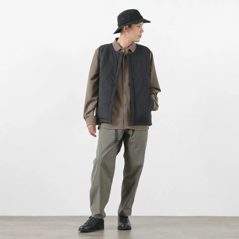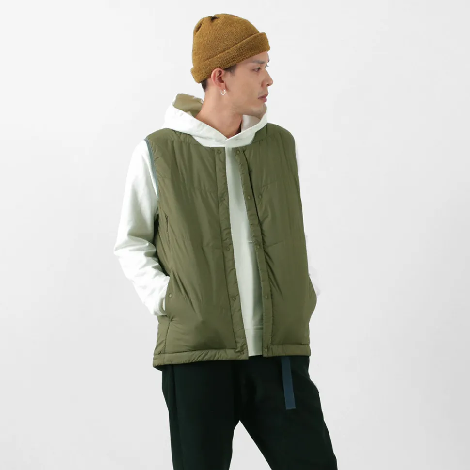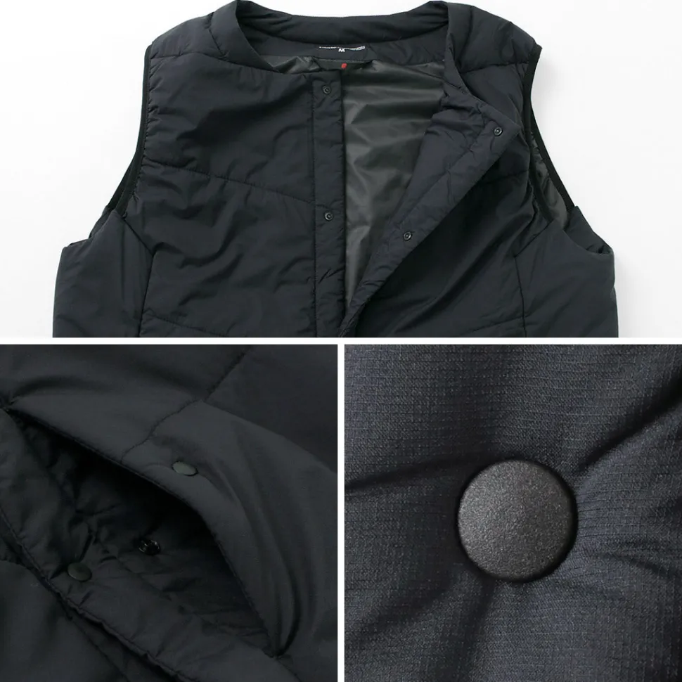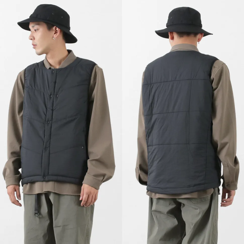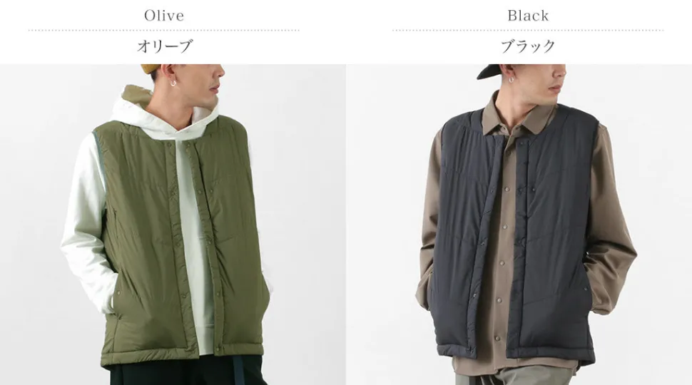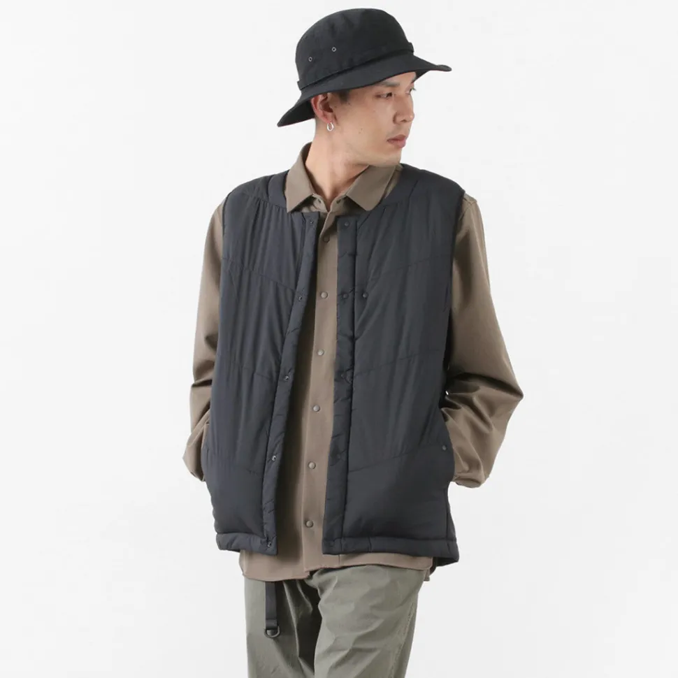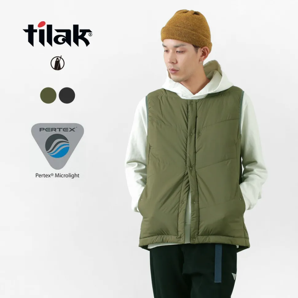 “TILAK / TILAK” brings you a crew neck insulated vest. The biggest point is the fabric that uses lightweight, windproof and water-repellent “PERTEX microlight” for the outer fabric and “CLIMASHIELD APEX” synthetic fibre cotton for the inside, which is resistant to water damage and does not reduce the warmth of the fabric.