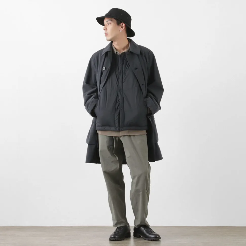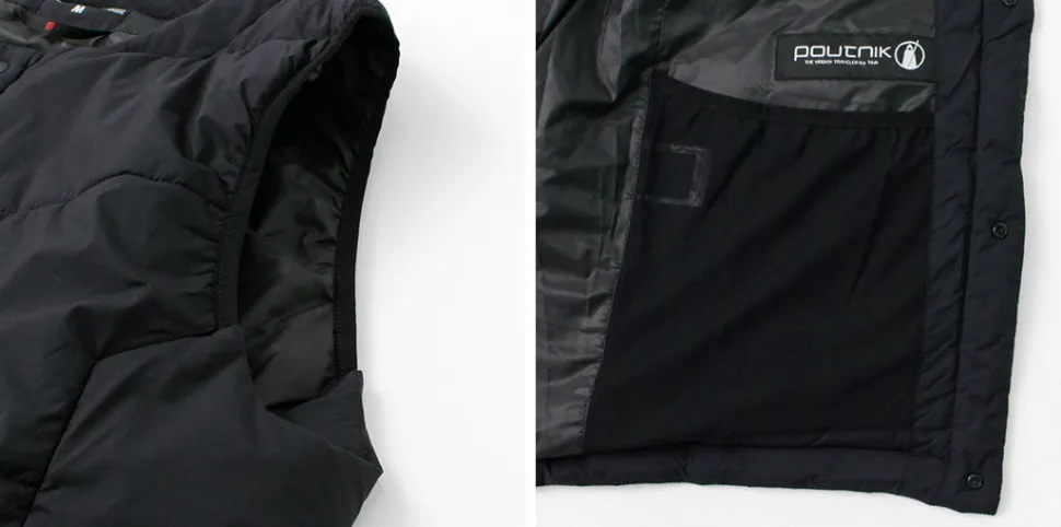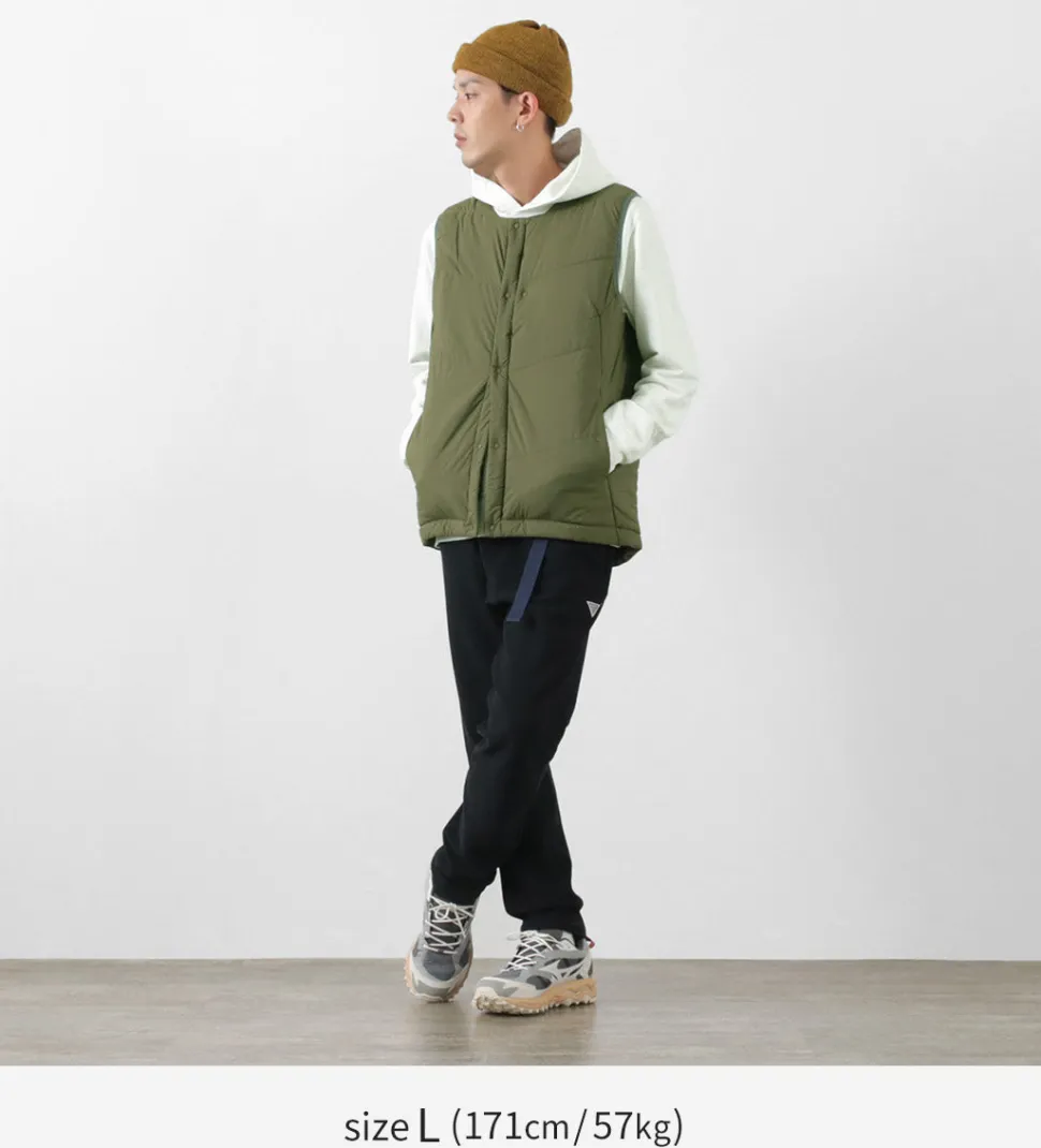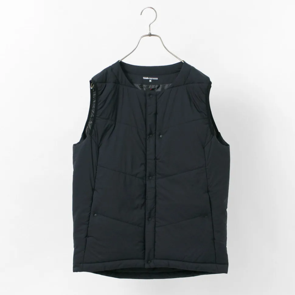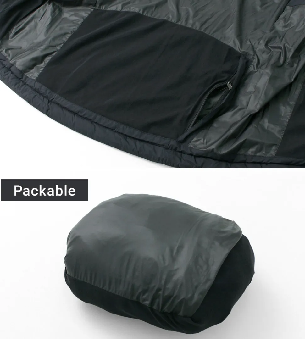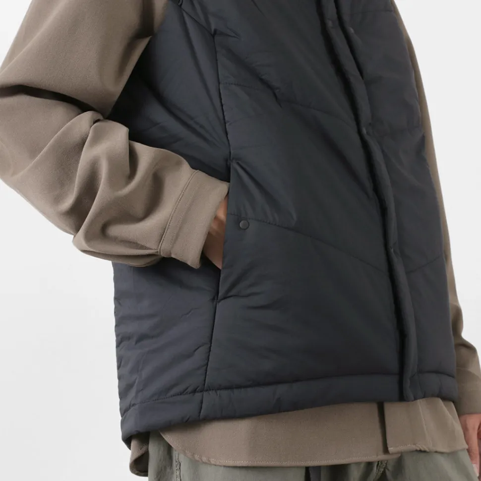 “TILAK / TILAK” brings you a crew neck insulated vest. The biggest point is the fabric that uses lightweight, windproof and water-repellent “PERTEX microlight” for the outer fabric and “CLIMASHIELD APEX” synthetic fibre cotton for the inside, which is resistant to water damage and does not reduce the warmth of the fabric.