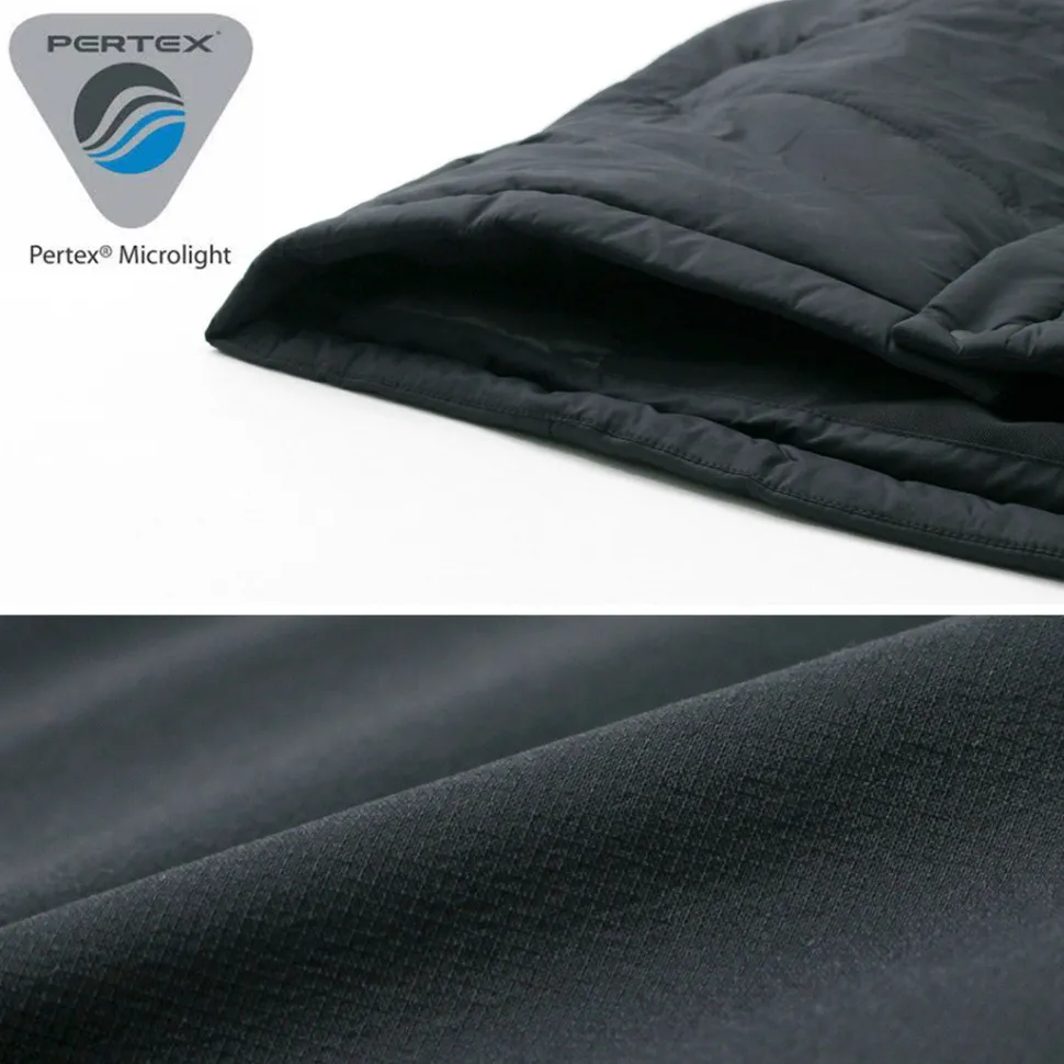 The outer fabric is made of lightweight, windproof and water-repellent PERTEX microlight, while the inner cotton is made of CLIMASHIELD APEX, a synthetic fibre that is resistant to water damage and does not reduce heat retention.