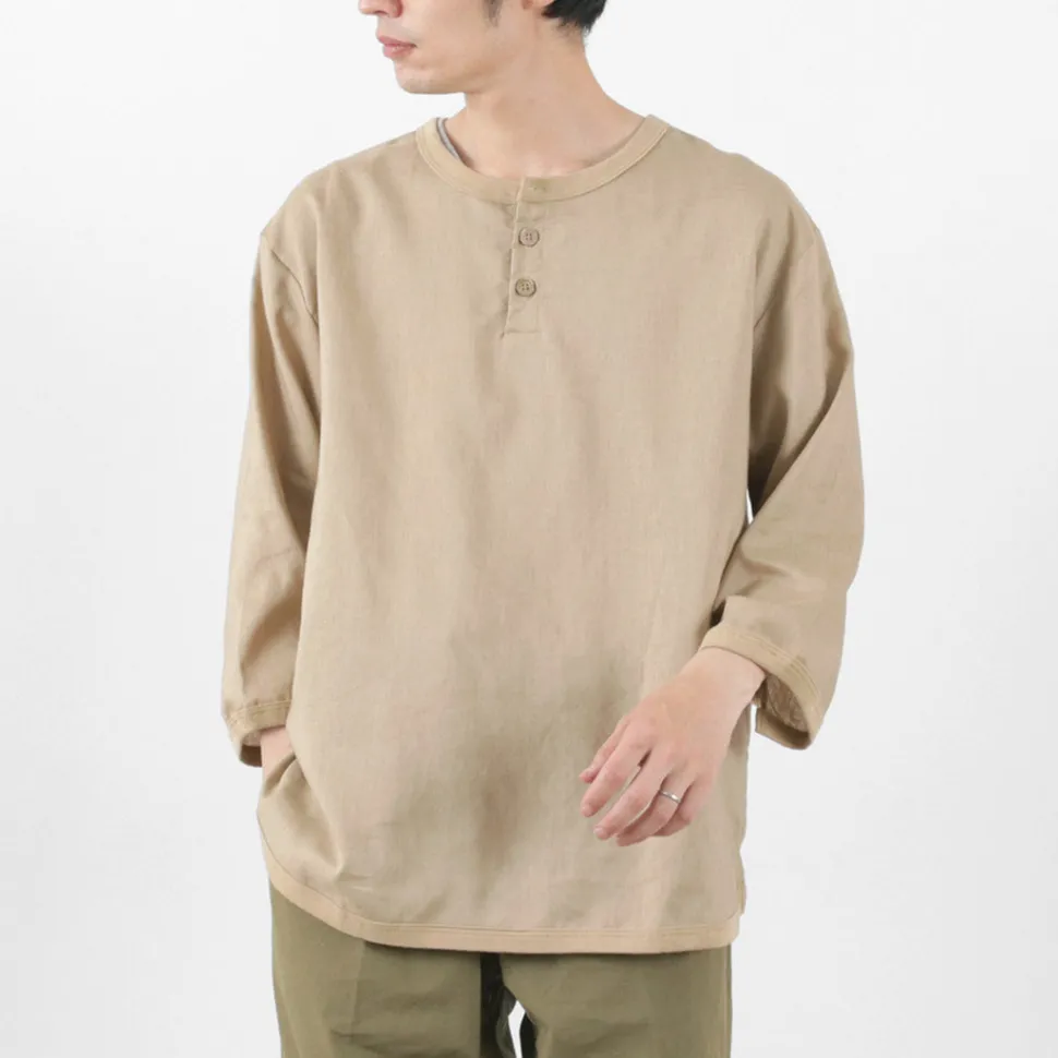 RE MADE IN TOKYO JAPAN introduces a henley neck T-shirt made of linen canvas fabric.