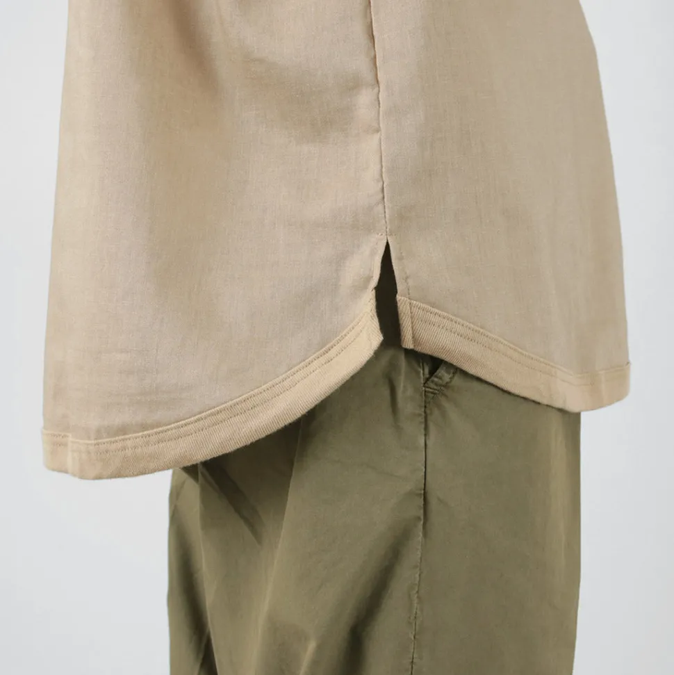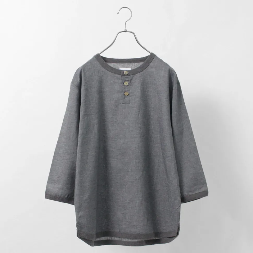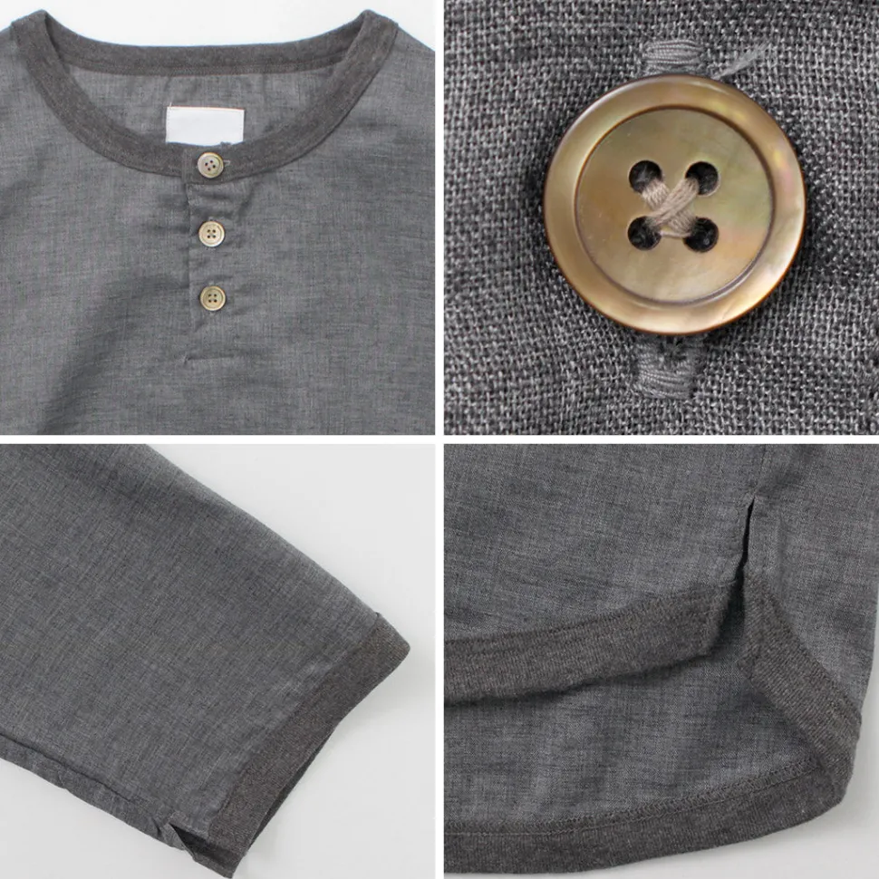 The henley neck design allows various nuances to be expressed by opening and closing the buttons. The luster of the brown-lipped shell buttons creates an elegant atmosphere.