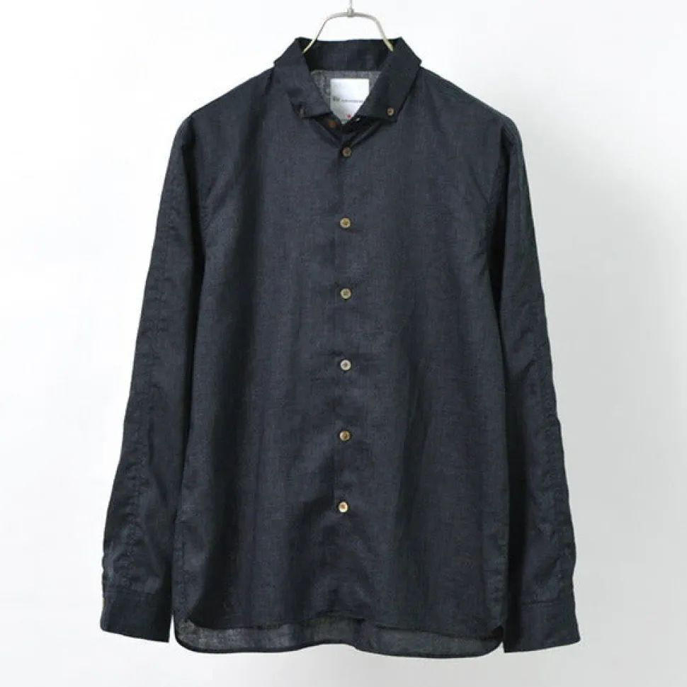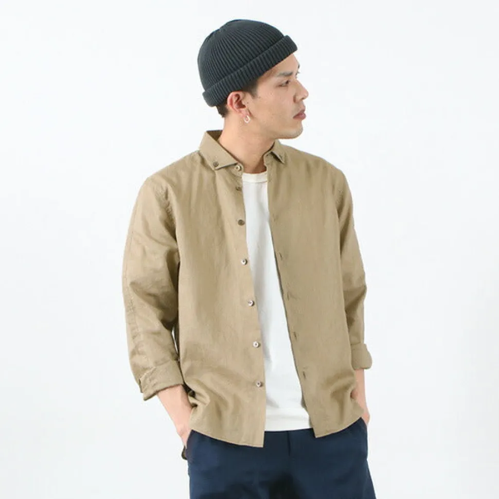 Button-down shirt made of classy linen canvas. The coolness characteristic of high-quality linen material and its lightweight comfort are attractive. The split raglan sleeves allow for a wide range of motion, making it easier to move around and more relaxed than it looks. Linen with excellent water absorption, wicking and durability Canvas
