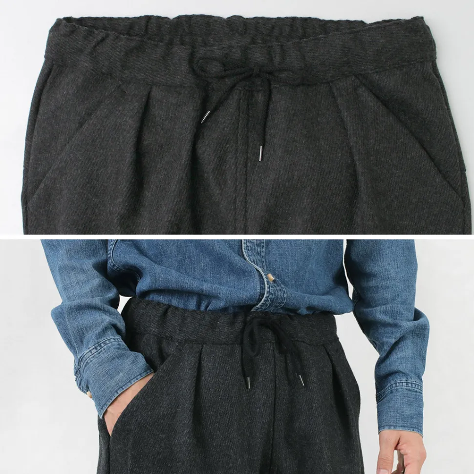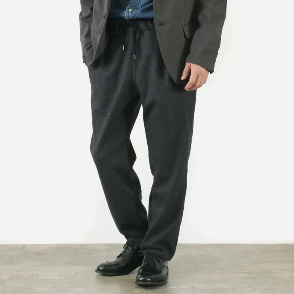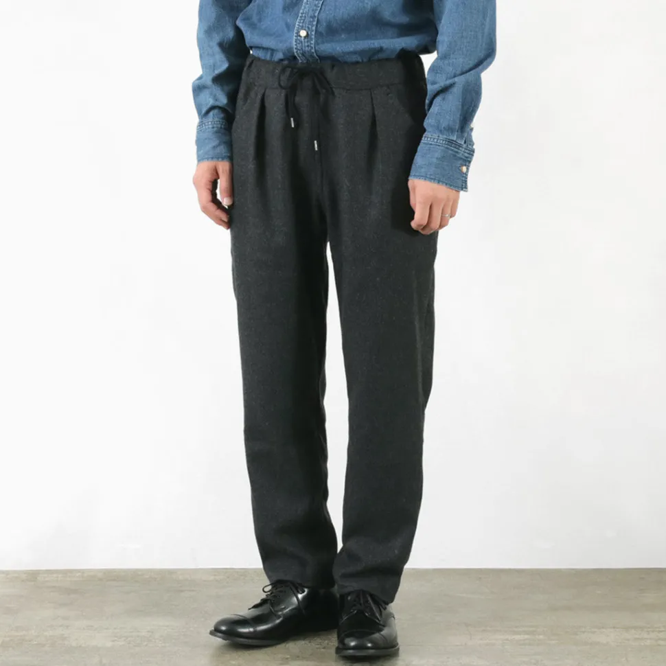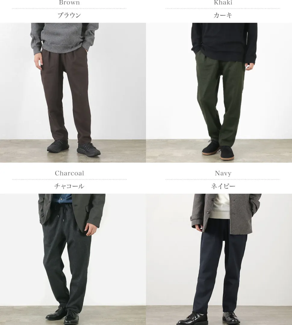 Introducing wool calze tuck pants blended with cashmere, which showcases a relaxed design with high-quality materials. The three-dimensional texture and deep color tone are perfect for stylish men’s style. The fabric is also thick and provides excellent insulation, making it ideal for autumn and winter.