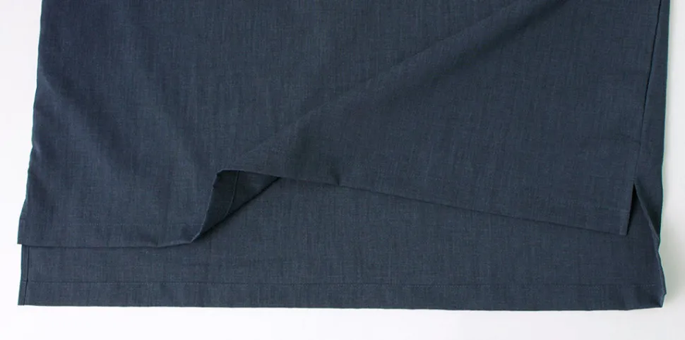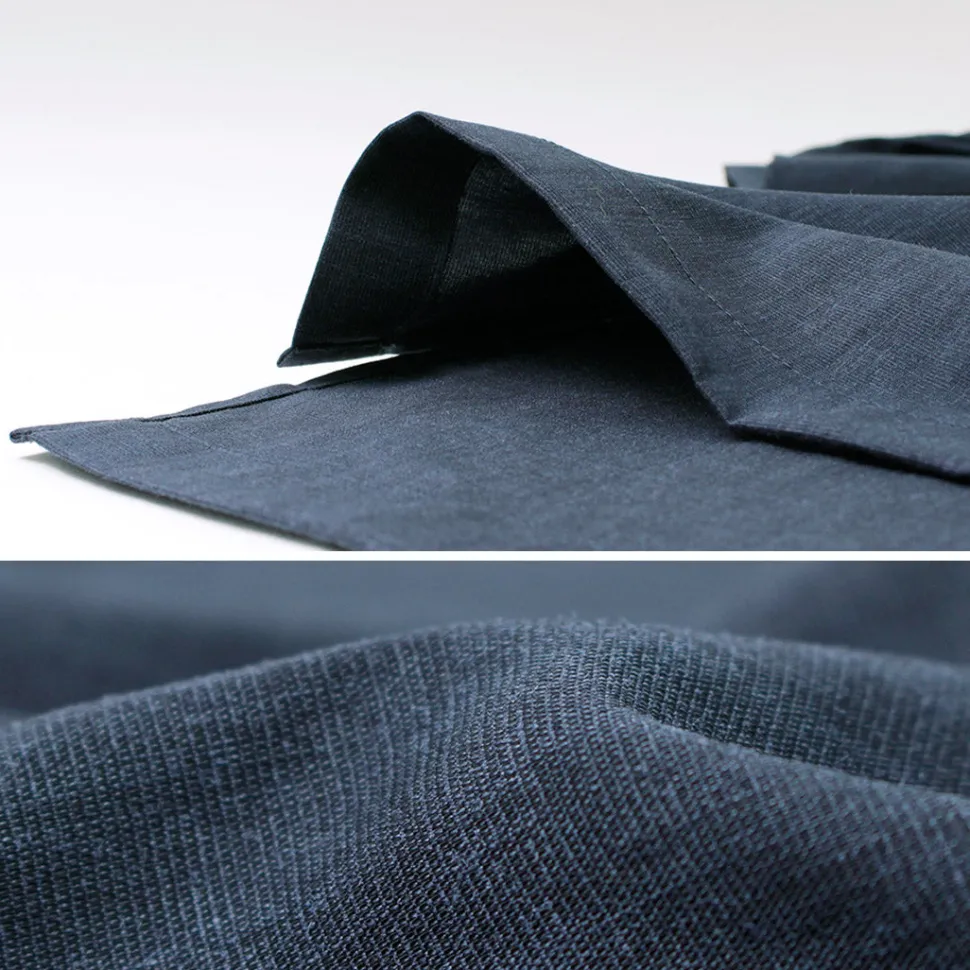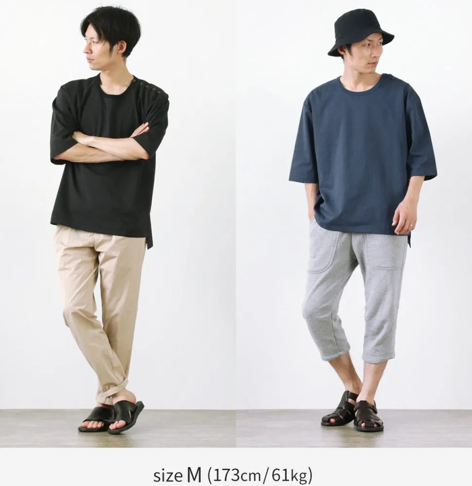 Short-sleeved T-shirt in a hybrid fabric blended with ramie, a type of hemp, and the functional material “COOLMAX yarn”. The buttons on the shoulders are reminiscent of sleeping shirts. A piece with shoulder button accents reminiscent of a sleeping shirt.