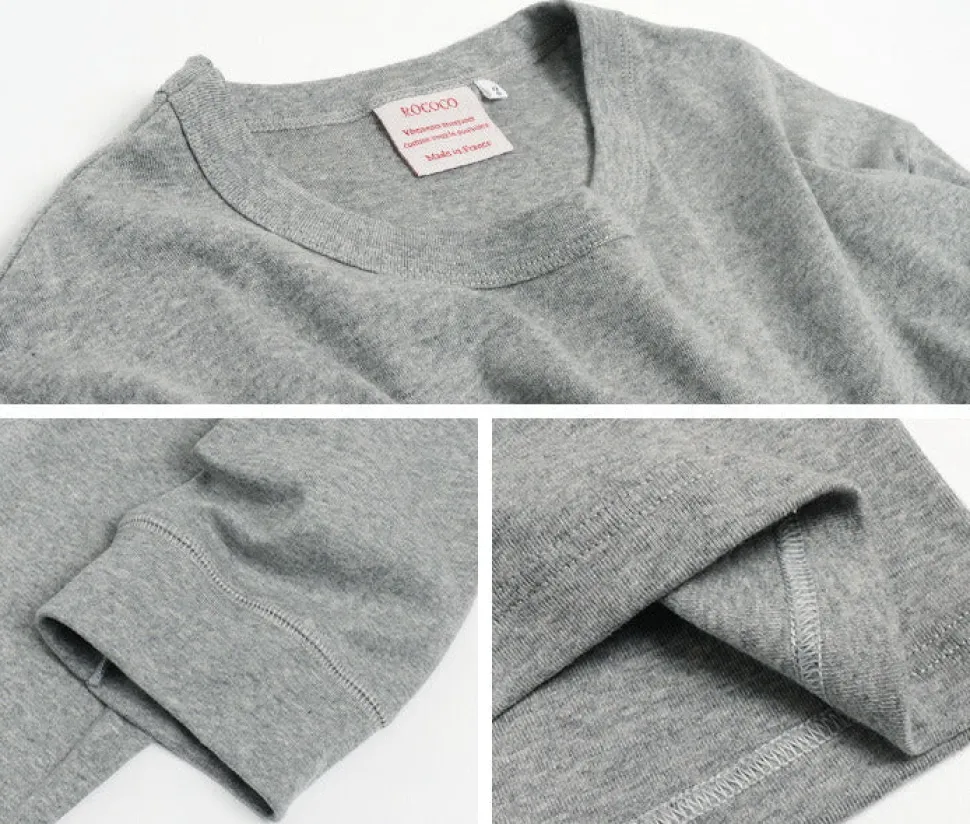 This crew neck t-shirt has a high elasticity and fits well to the body. The wide ribbing on the sleeves, typical of military underwear, gives this t-shirt a classic look that can be worn on its own or layered with other items or as an inner layer for autumn and winter. Made in France There are many famous cut and sew brands such as ORCIVAL and PETIT BATEAU in France, and there are many high quality sewing factories. ROCOCO’s cut-and-sew items are produced with such background. The sewing of this item is done carefully at the factory which has undertaken famous brands such as QUOTIDIEN.