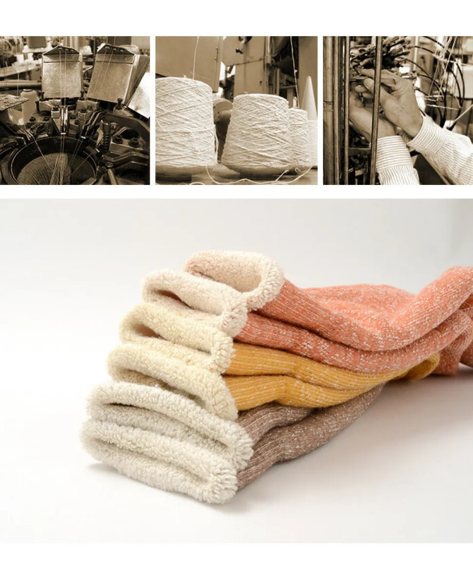 The outer side is made of highly insulating The outer side is made of warm merino wool and the inner side, which touches the skin, is made of undyed organic cotton from the USA. After knitting, the fabric is product-washed to remove oil and give it a soft and fluffy texture.