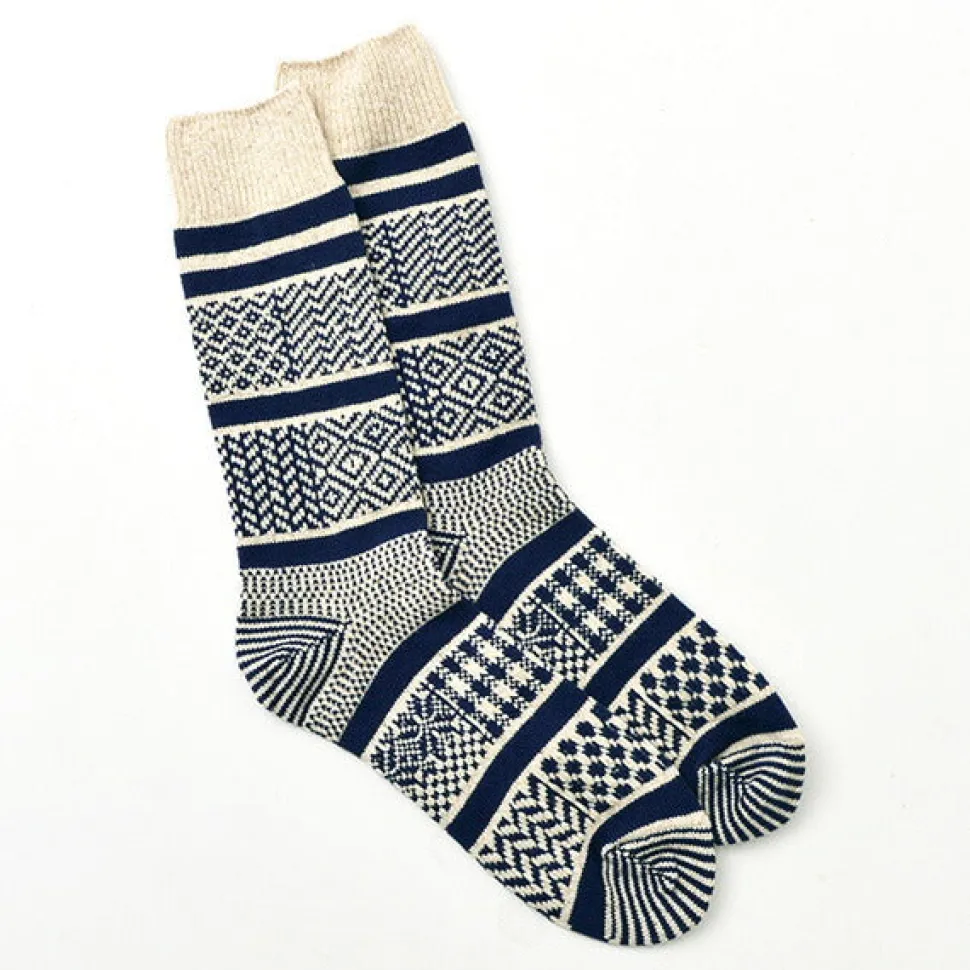 Crew socks with a mixed design of various jacquard patterns. The three-dimensional Jacquard weave has a stiff image, but the silk-blended fabric used in these socks is smooth to the touch.
