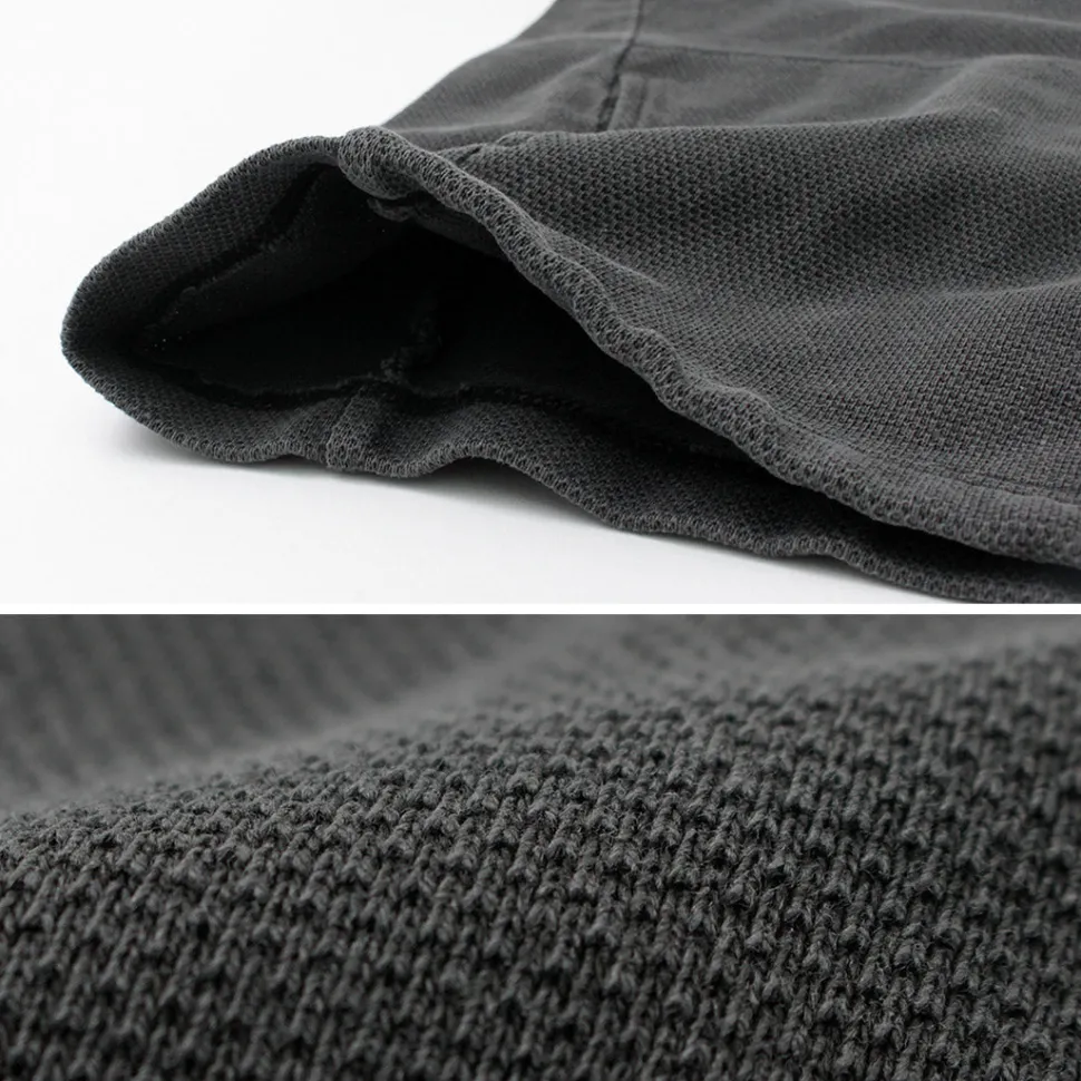 The original fabric knitted with open-ended yarn is used. It is characterized by a dry feel against the skin and can be worn comfortably even during the sweaty season. The moderate thickness of the fabric allows it to be worn for a long season.