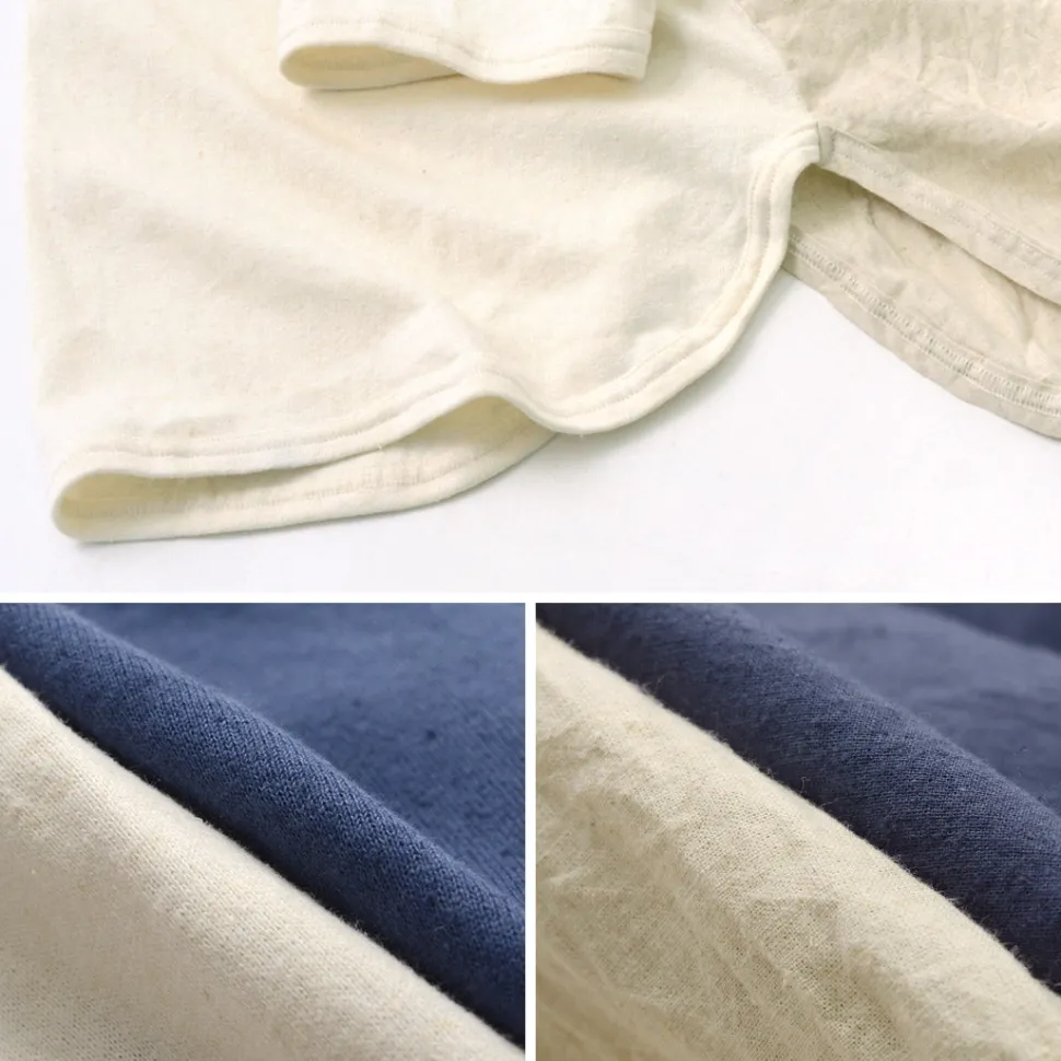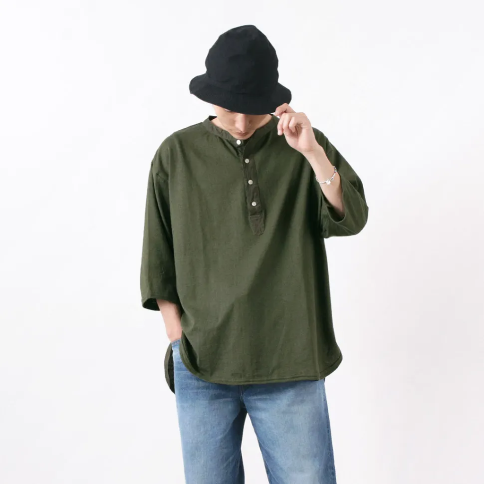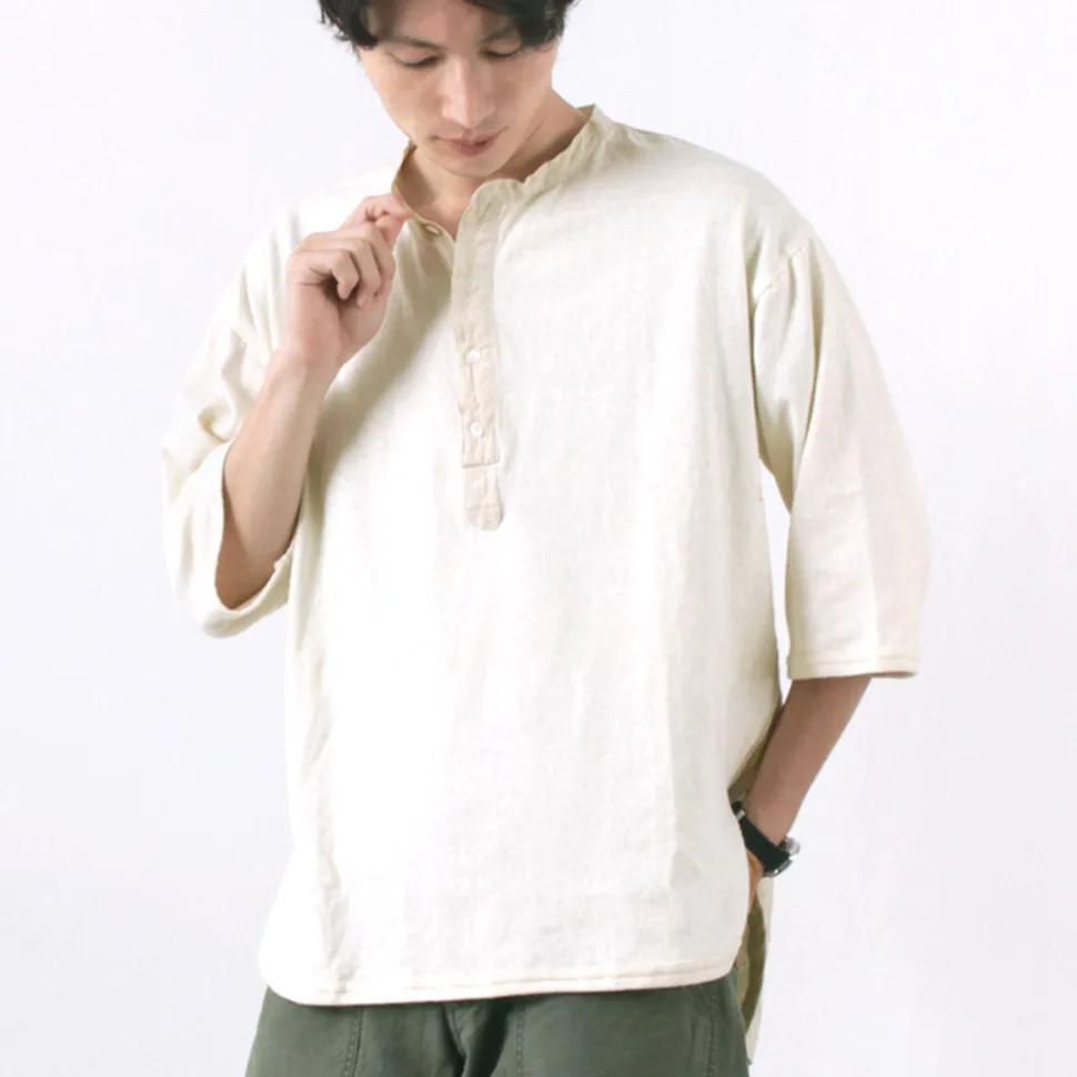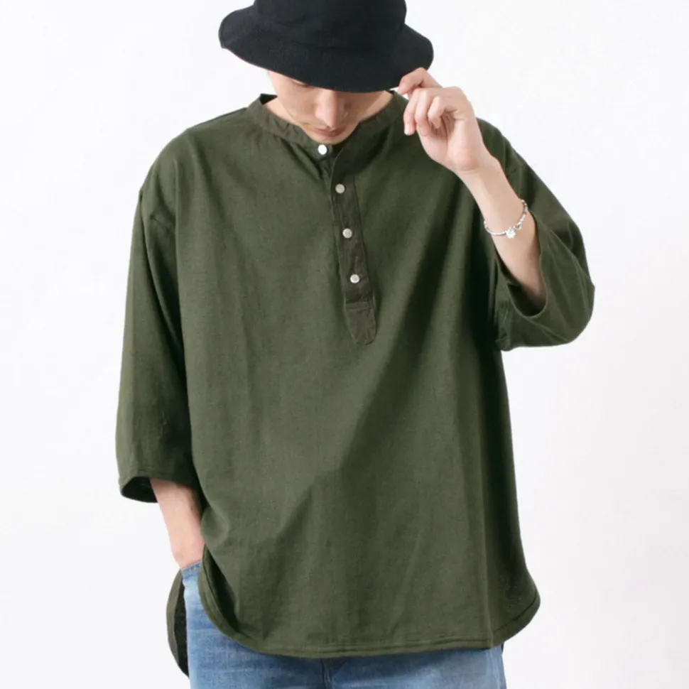 The neck and placket are made of the same shirt fabric as the back of the shirt, with a henley neck. The buttons are made of natural shell buttons with an attractive sheen.