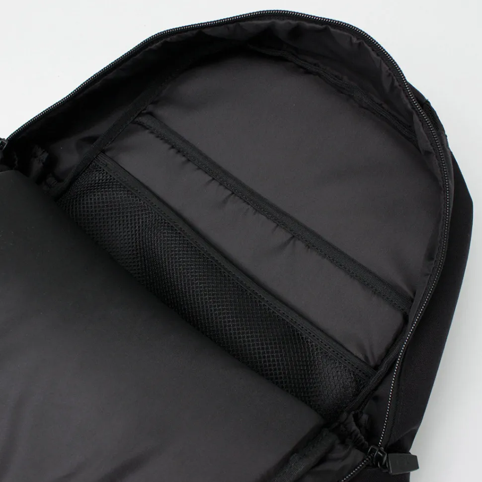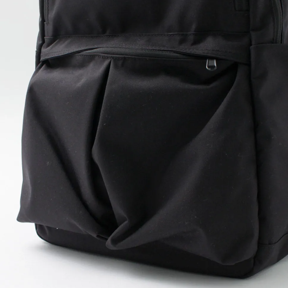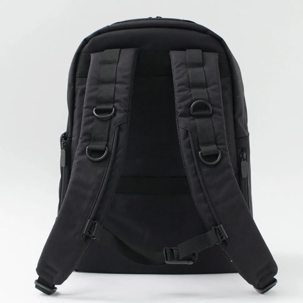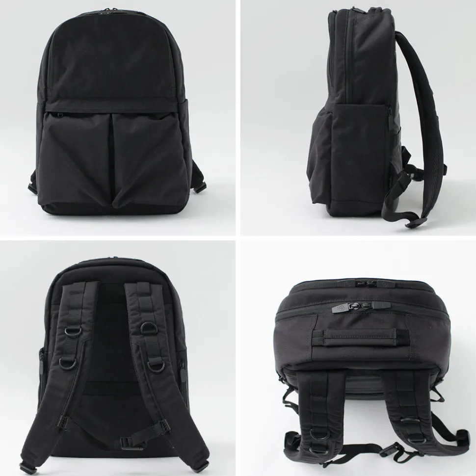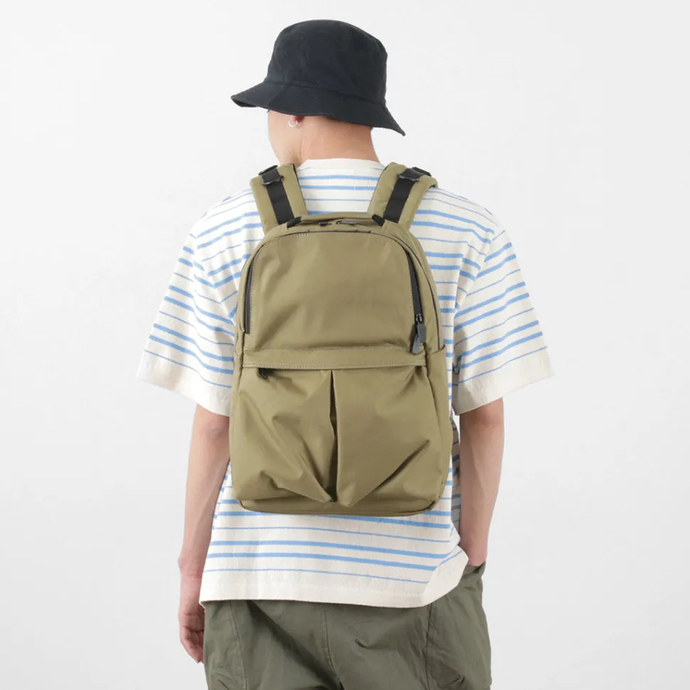 The design of this daypack is based on the helmet bag, which originated when U.S. Air Force pilots carried their favorite helmets. It features a helmet bag-style arrangement tucked into the front pocket.