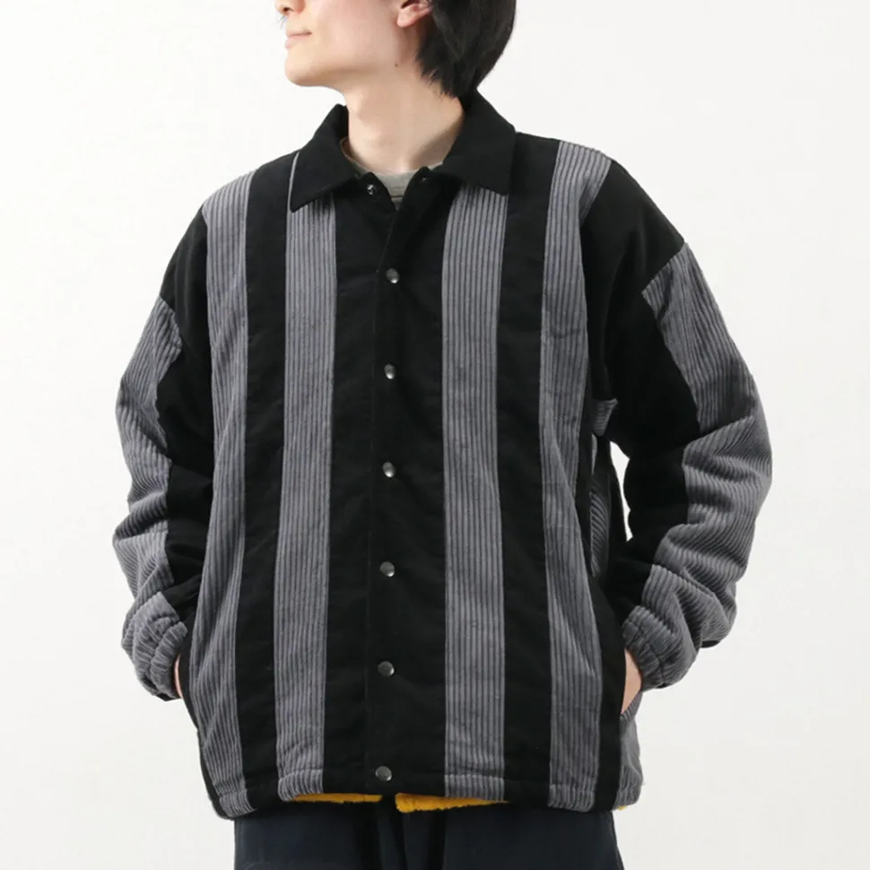 Introducing a padded coach jacket from SON OF THE CHEESE, featuring corduroy fabric arranged in a striped pattern.
