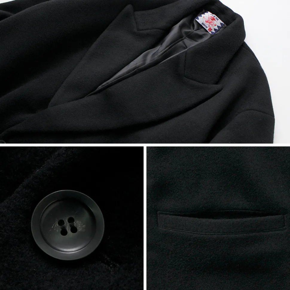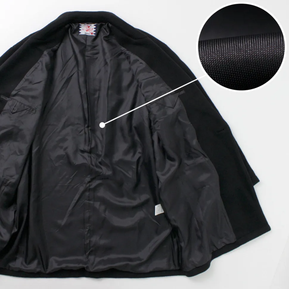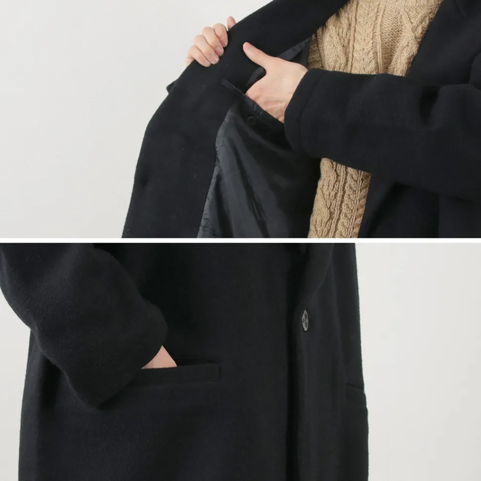 The fabric is made from wool, and it undergoes a process of felting to create a beaver-like finish. It has a soft touch and a glossy, refined appearance. Despite its substantial thickness, it feels light to wear and offers excellent insulation.