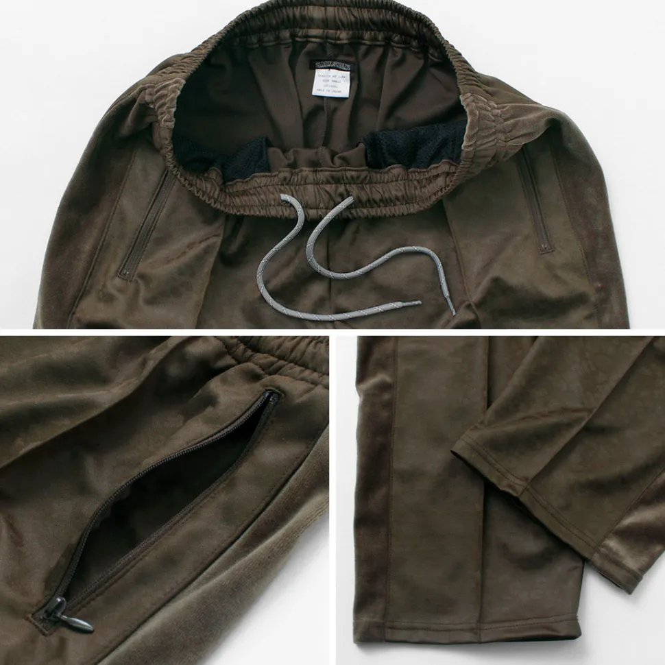 These easy pants have an adjustable elastic waistband and drawcord. The silhouette is wide with a loose fit, but the pin-tucked crease lines and velour lines on the sides give an elegant impression. Not only the looks, but also the high-quality cutting and sewing are noteworthy.