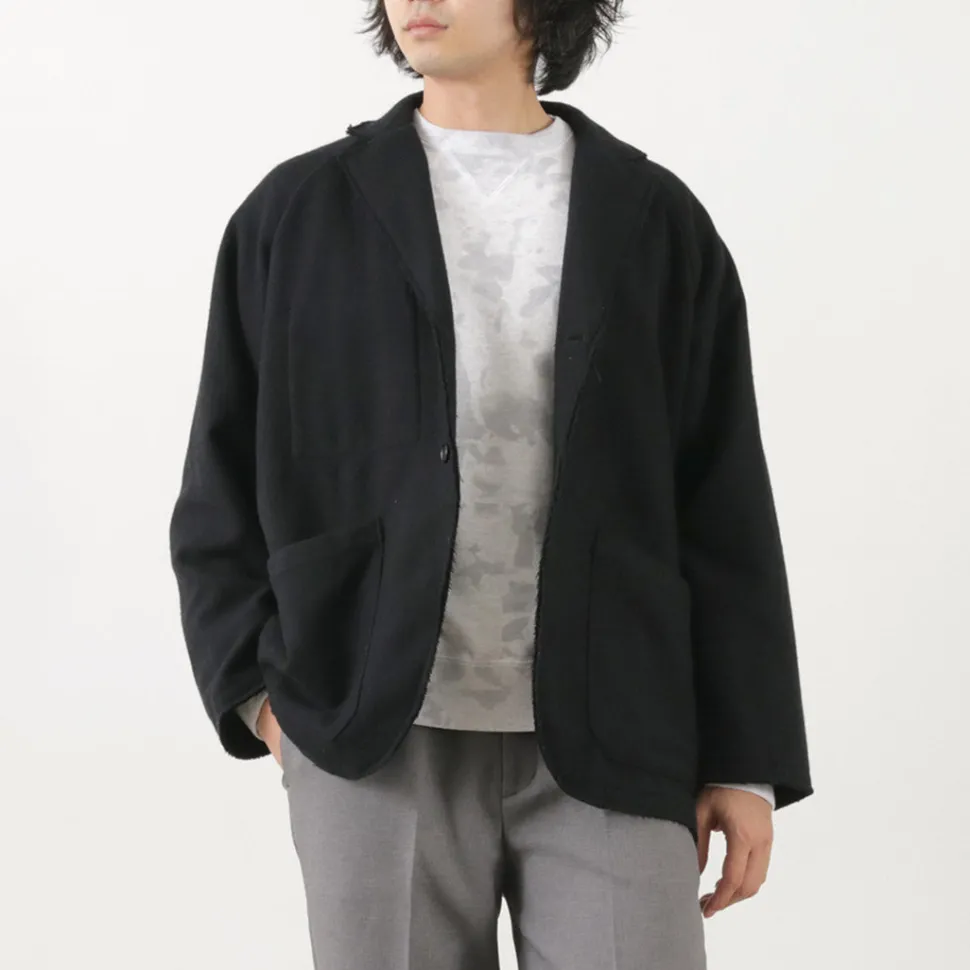 This item is an elegant tailored jacket with cut-off details to create a rough finish, giving it a good sense of discretion. The warm wool mosser fabric is used to create a seasonal mood.