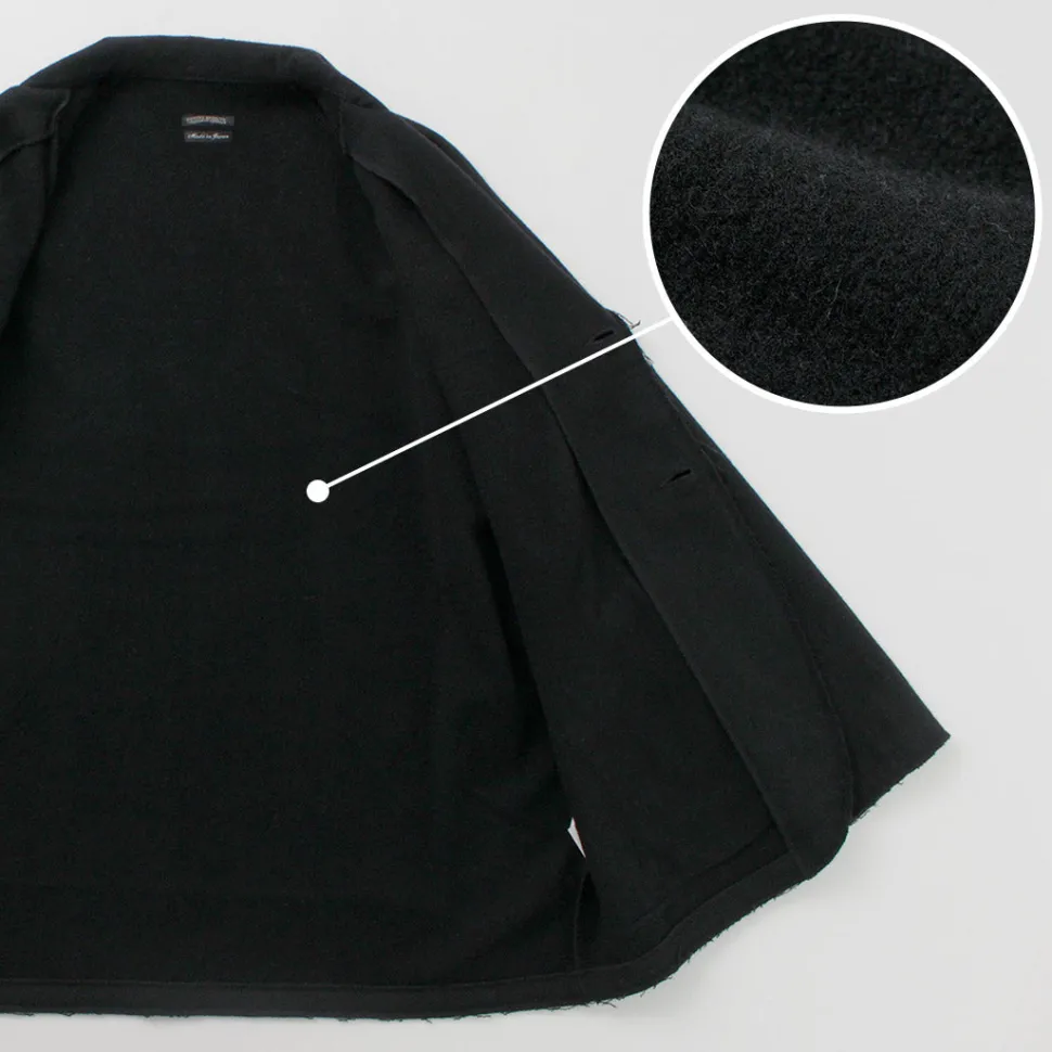 Introducing a jacket designed based on American medical wear. This item has an elegant tailored jacket with cut-off details for a rough finish, giving it a good sense of slackness. Warm wool mosser fabric is used for the fabric, creating a seasonal mood.