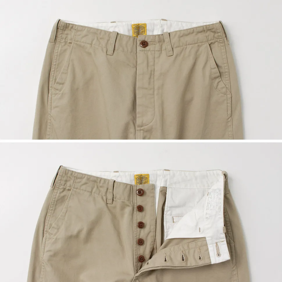 Based on the military chinos of the 40’s, these ultra-wide chinos were produced in pursuit of THE BLUEST OVERALL’s unique style.