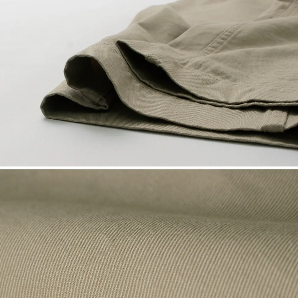 It uses twill fabric with moderate thickness. It is finished with a natural texture unique to 100% cotton, and features a soft texture that feels good on the skin from the beginning. Also, it is recommended to enjoy your own taste as it changes over time as you wear it.