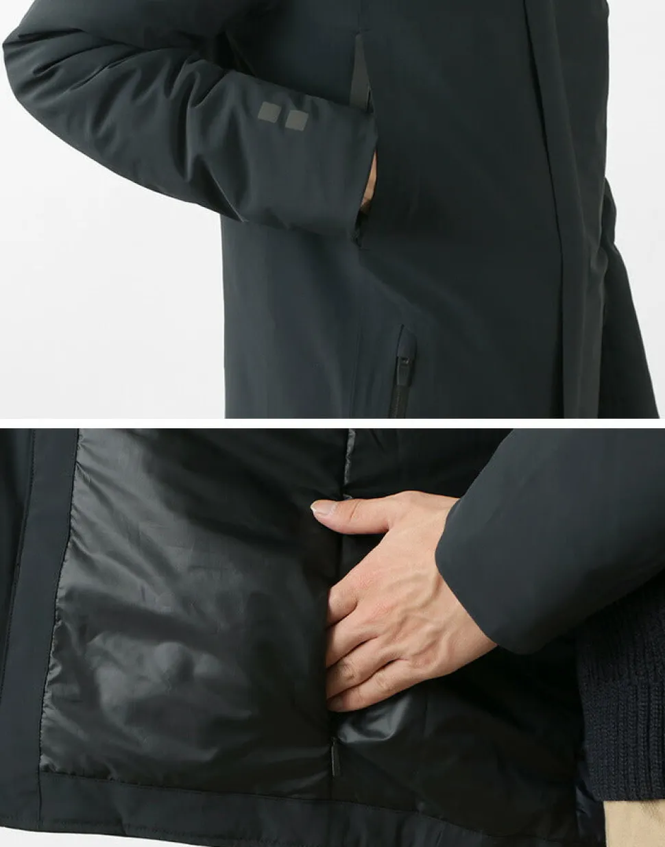 Featuring hand-warming pockets at the chest and zippered pockets with waterproof zippers on both sides of the hem.