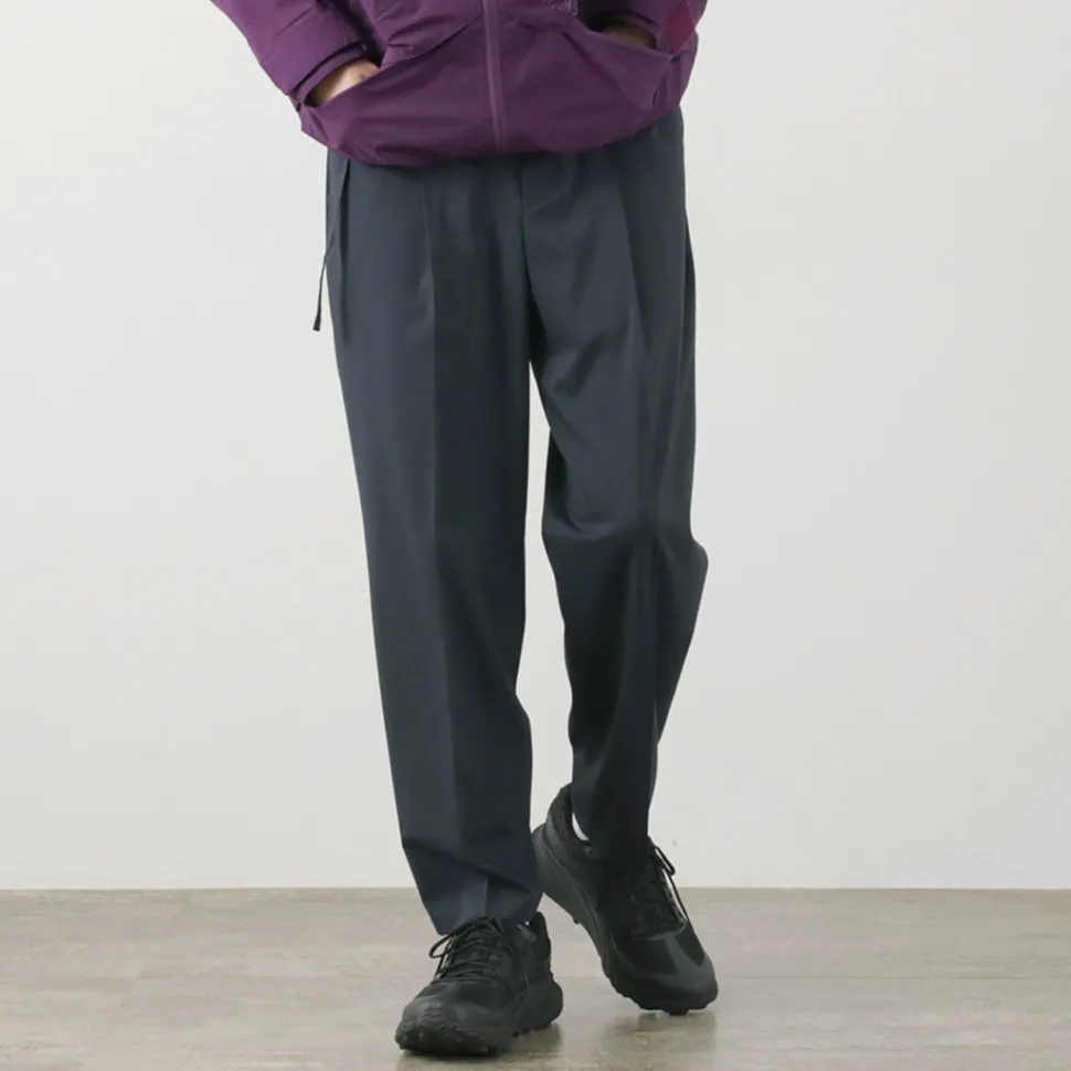The rise is shallow, and the hips are tapered with roominess. The slightly slim silhouette and center tuck create a relaxed yet sophisticated finish.