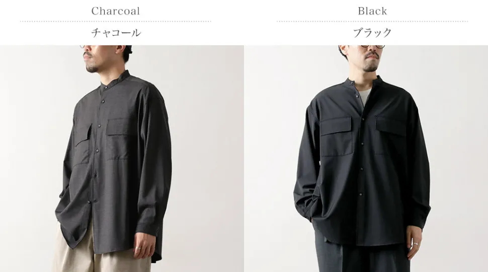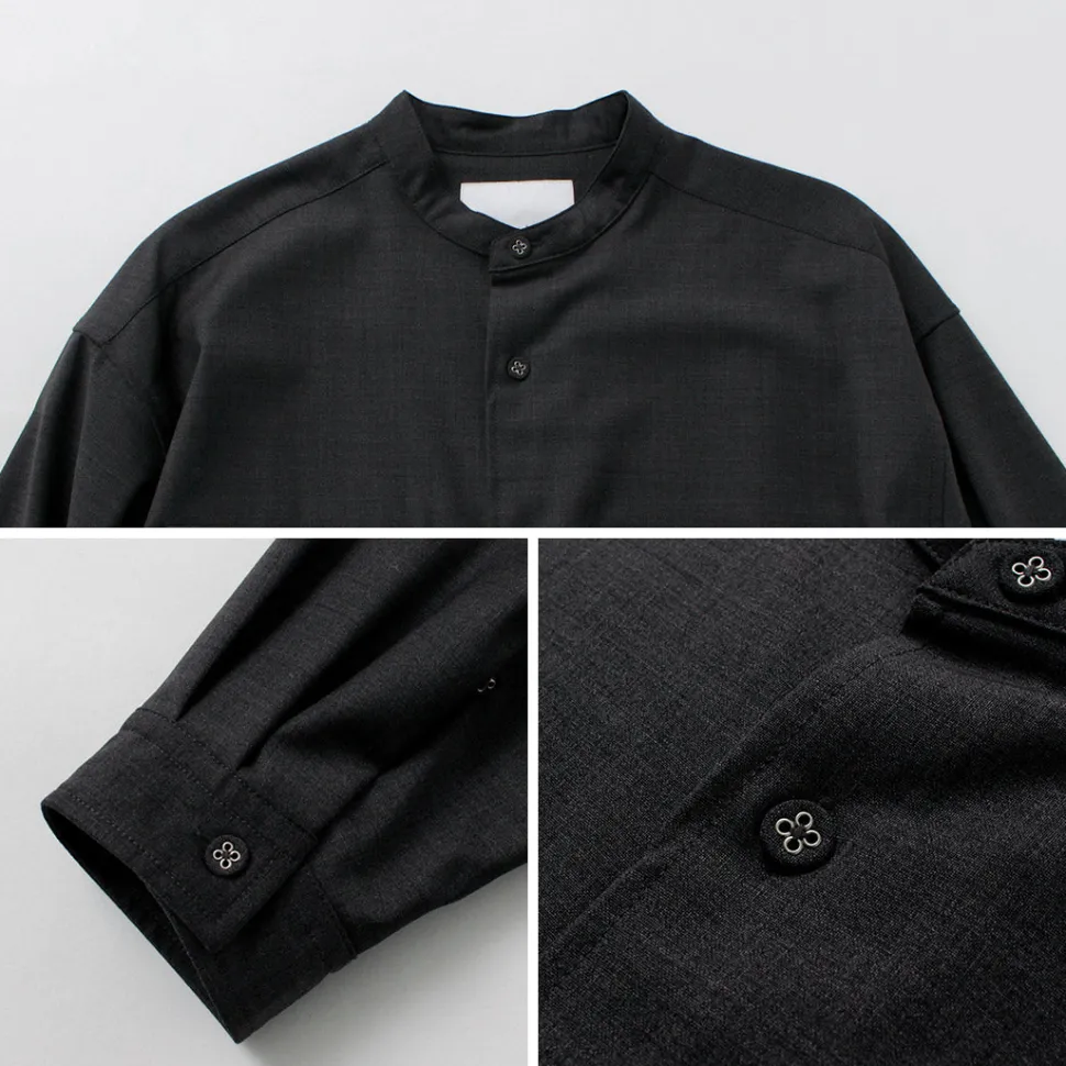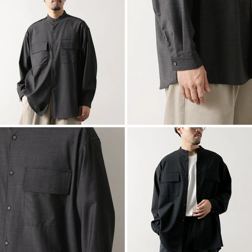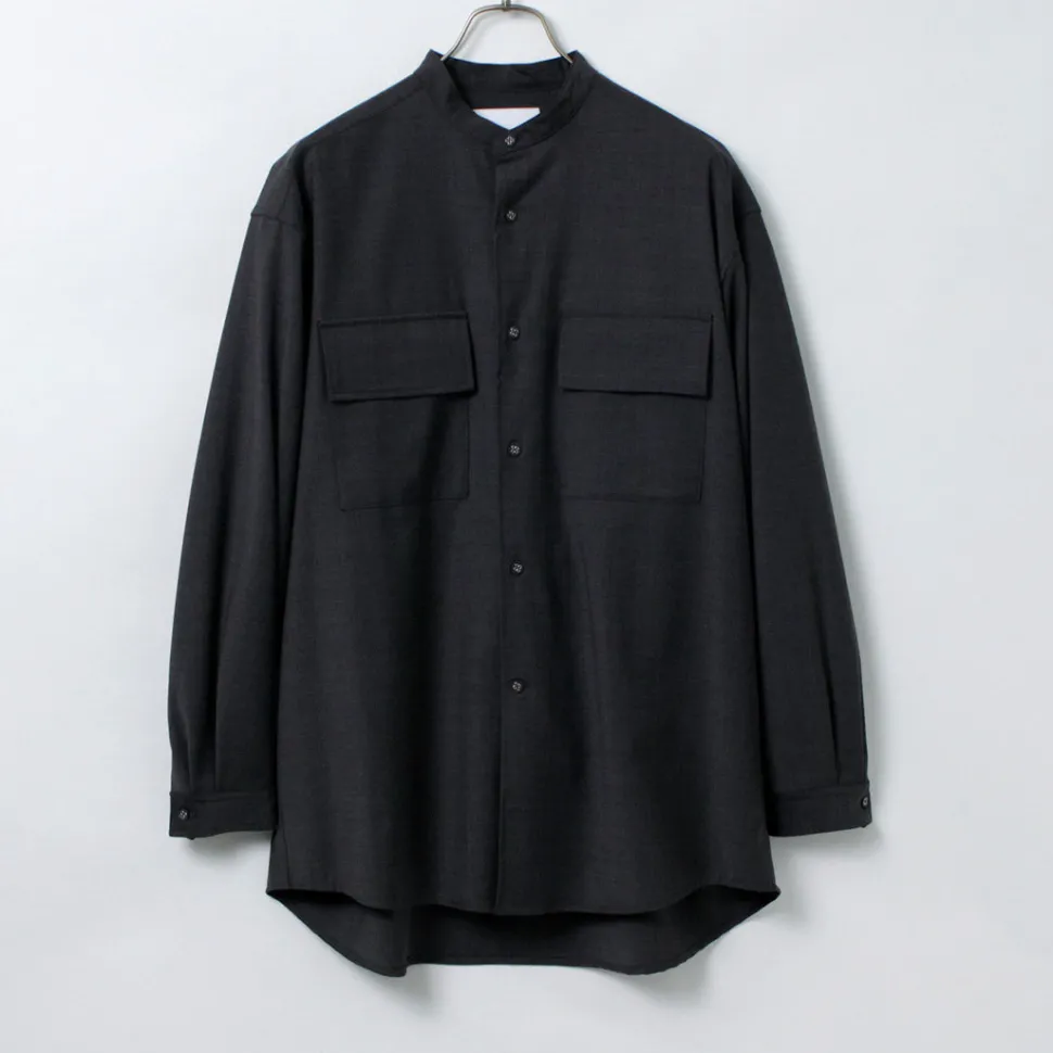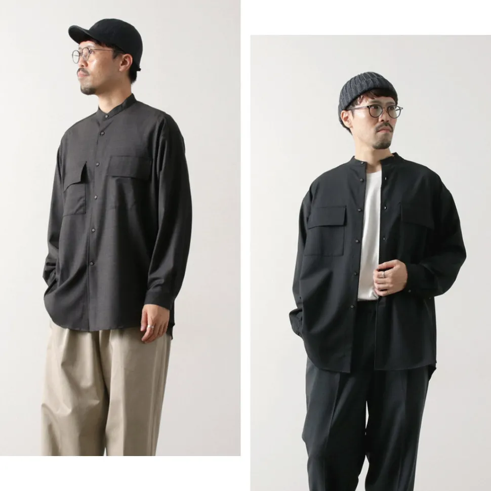 Introducing a band collar shirt with a classic silhouette from the Repose Wear series by White Mountaineering.