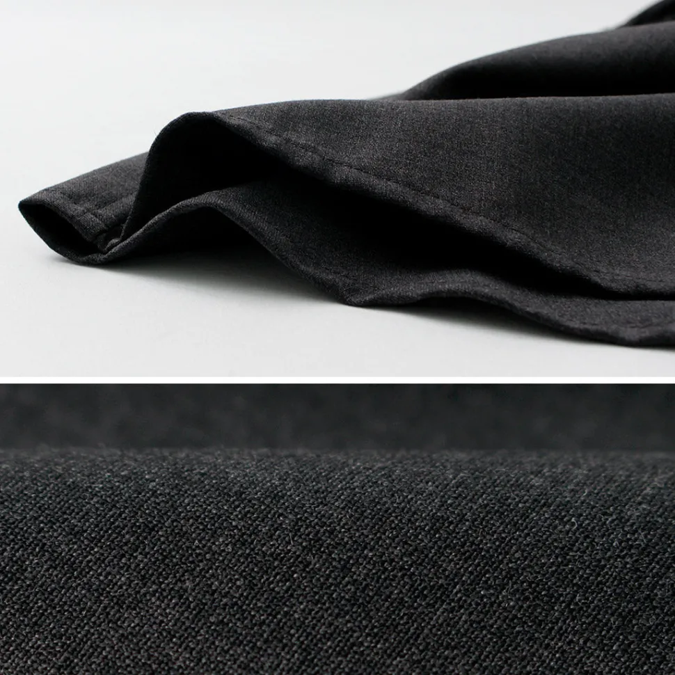 The fabric is a blend of 52% wool, 43% polyester, and 5% polyurethane. The wool provides natural warmth and softness, while polyester adds lightness and wrinkle resistance. The polyurethane ensures stretch for easy movement and a comfortable fit.