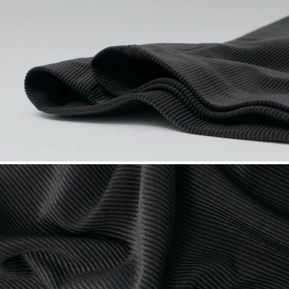 These pants replicate the look of corduroy using a vertically knitted tricot fabric. The lightweight, soft texture ensures comfort, and its breathability makes it suitable for layering in winter without causing discomfort. The fabric is wrinkle-resistant and machine washable, making it easy to care for.