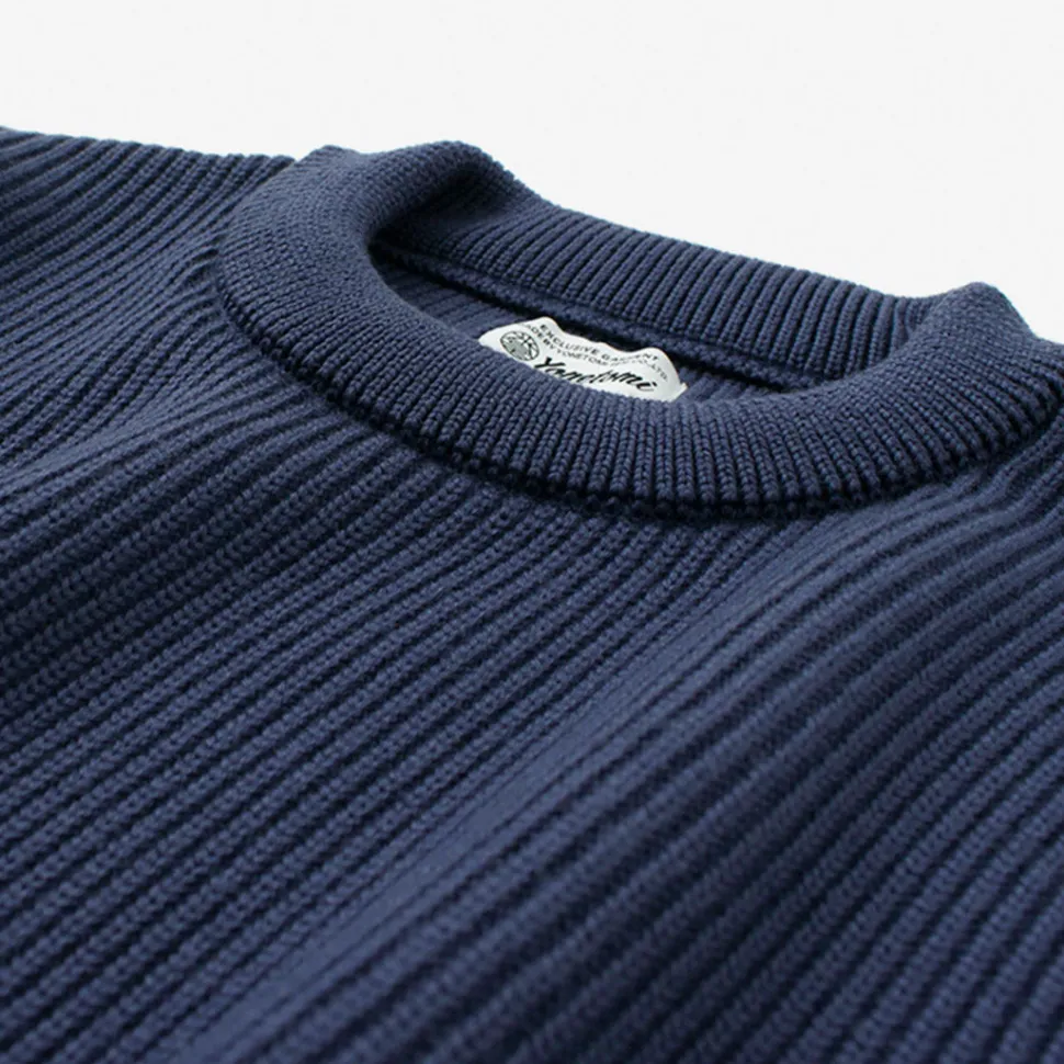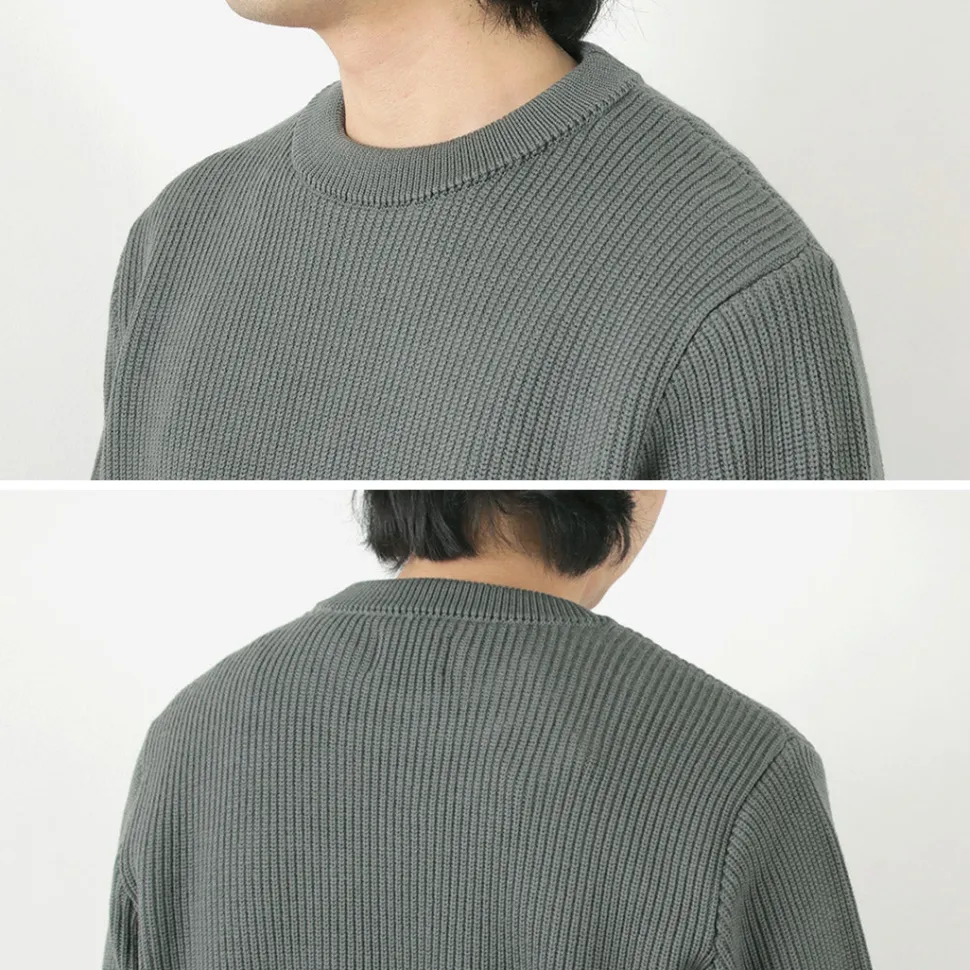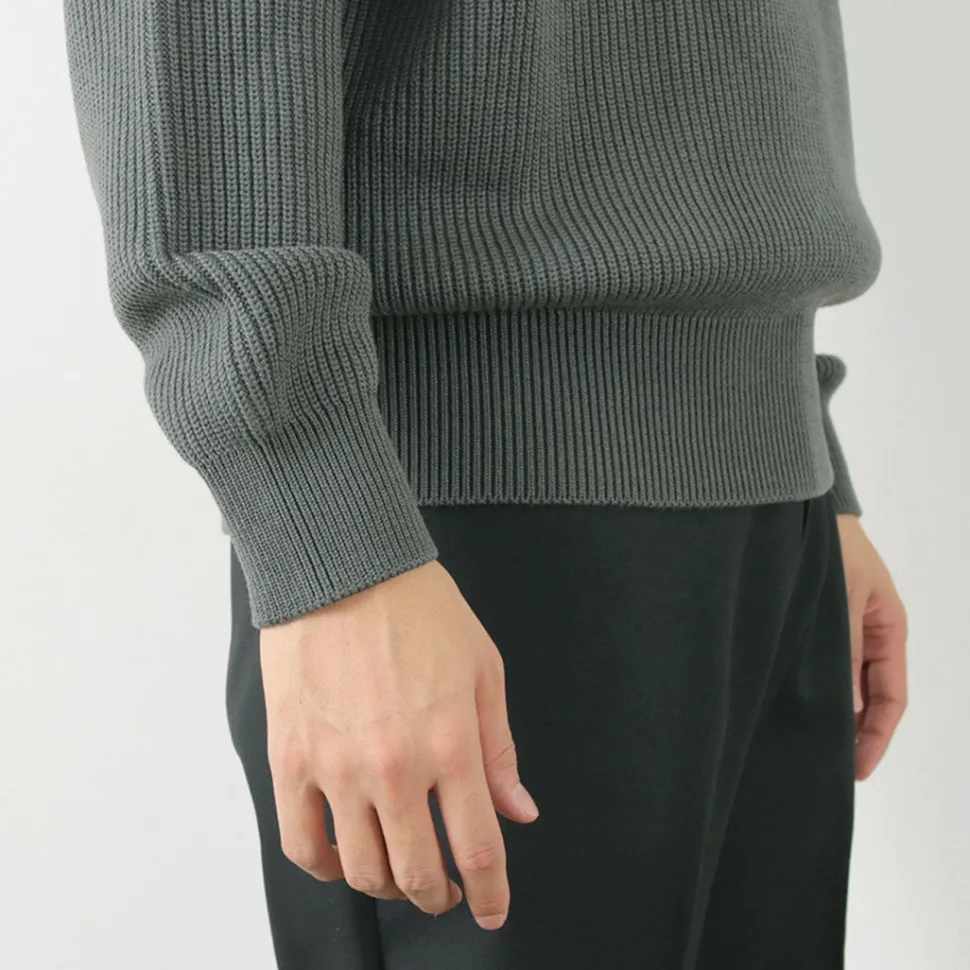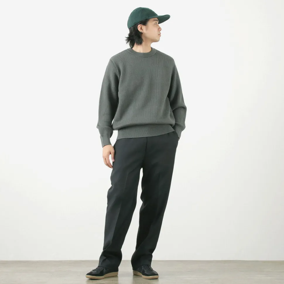 This crew-neck sweater is knitted with half cardigan knitting, using Italian wool. The simple design, with a flat appearance and no decorative techniques, makes this a basic piece suitable for a variety of occasions.